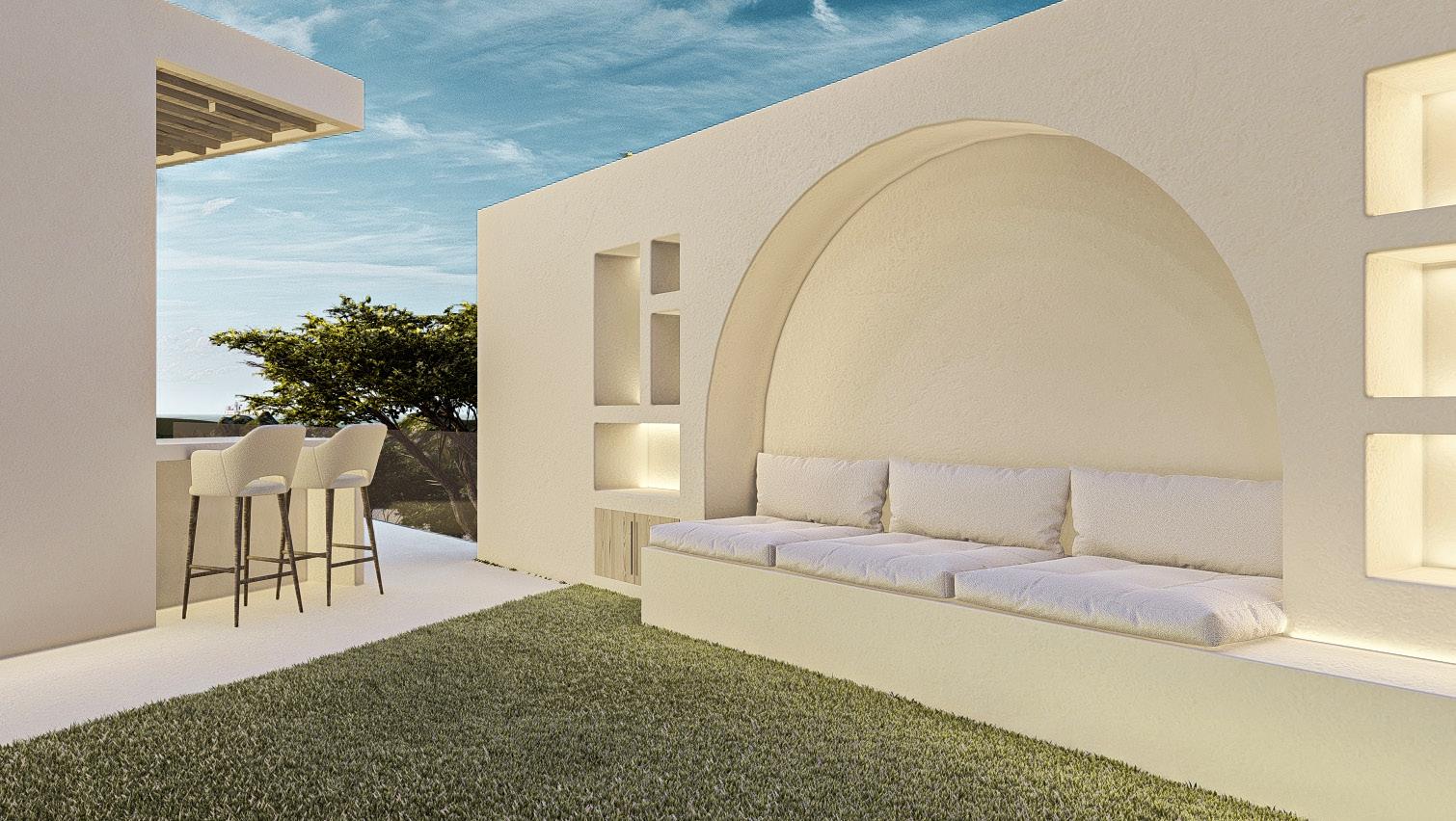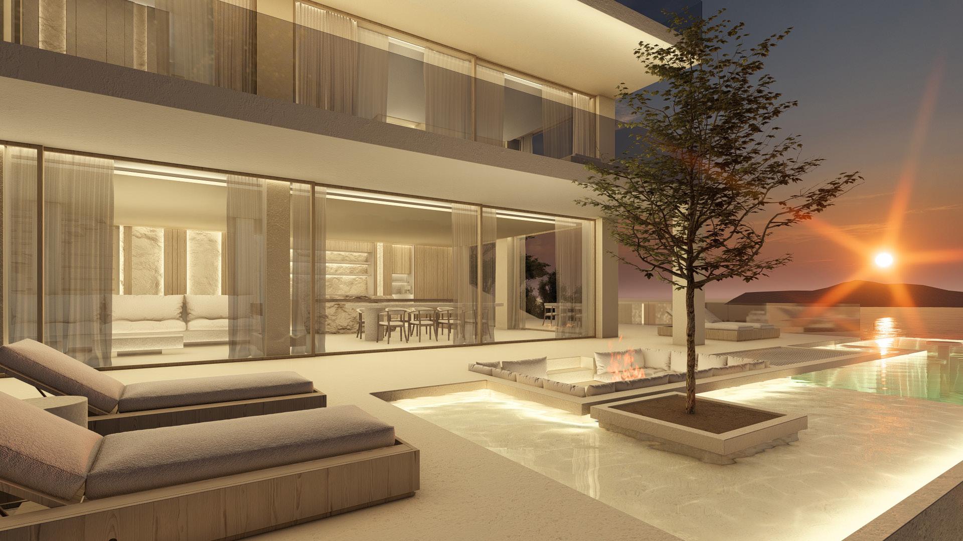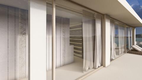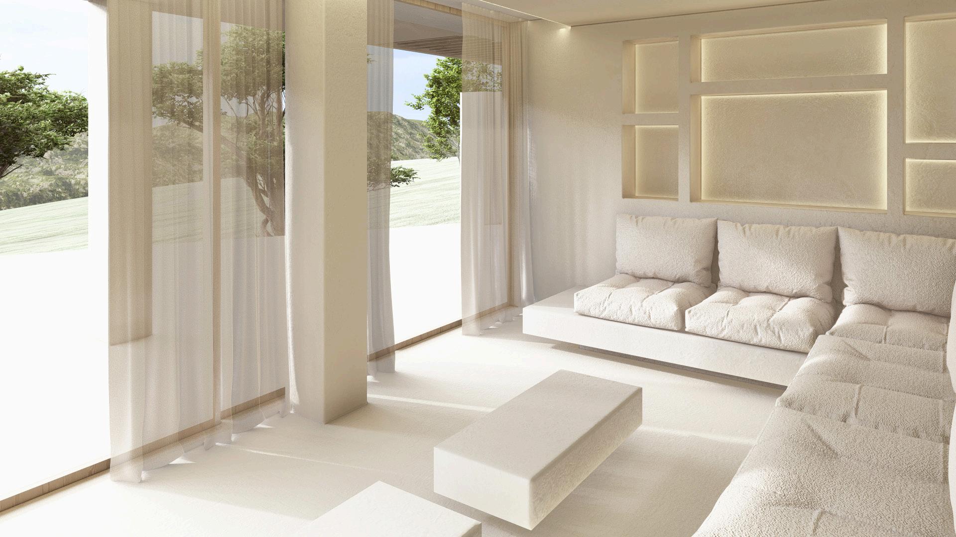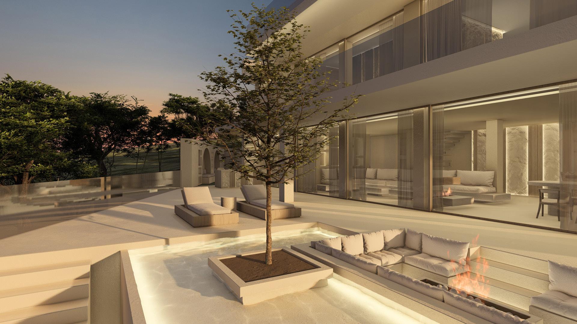 Two bedroom villa with open concept living areas. Minimal monotone design, with a touch of sophisticated elegance through golden details.