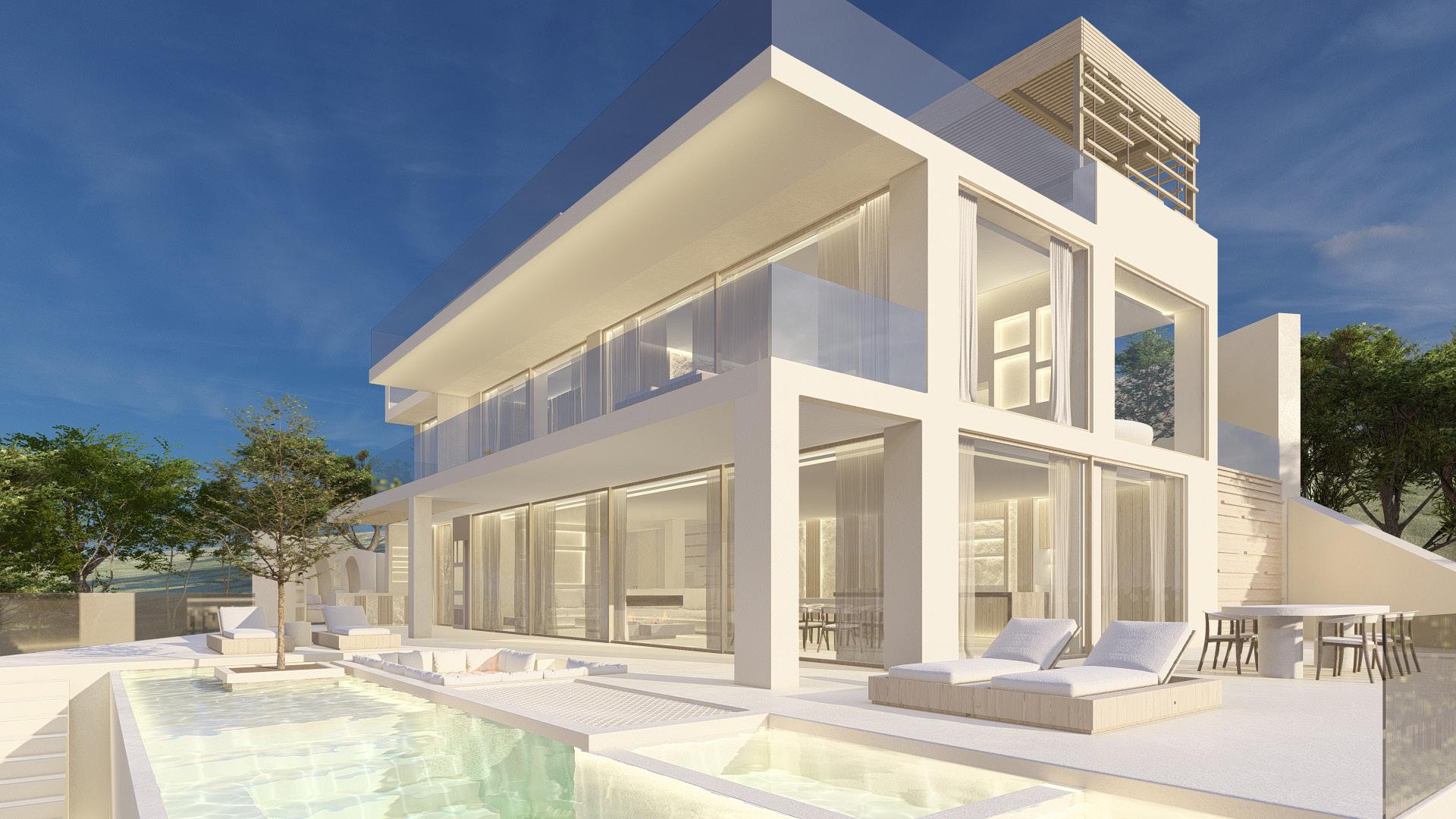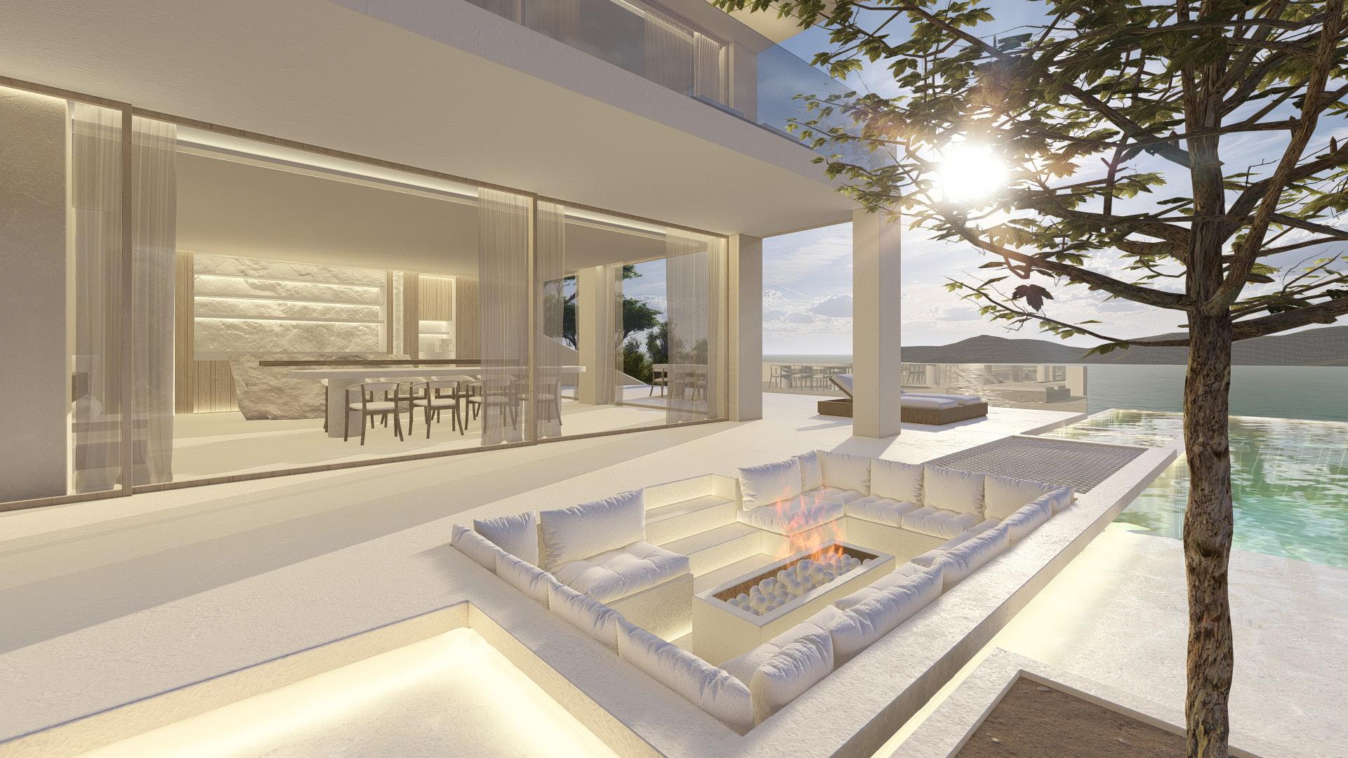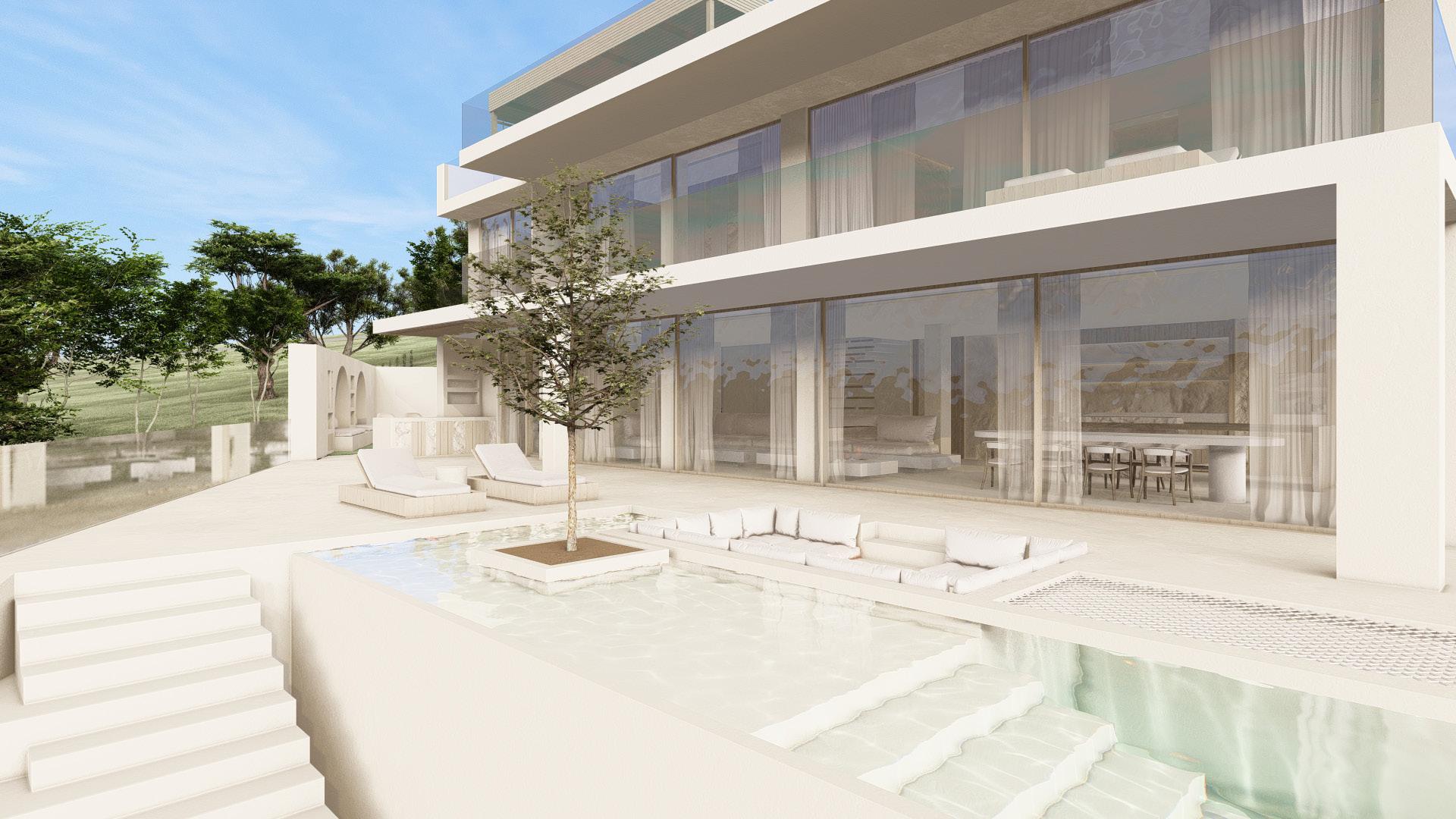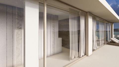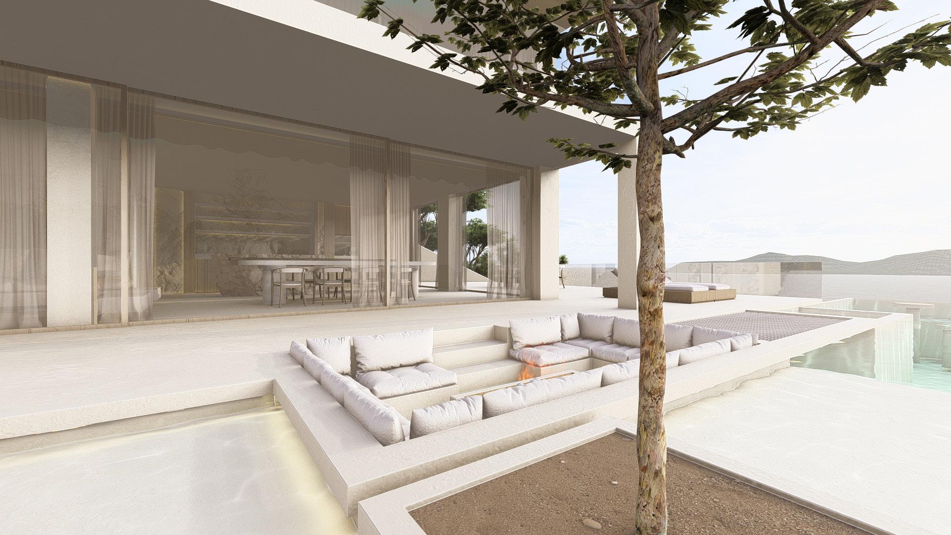 Two bedroom villa with open concept living areas. Minimal monotone design, with a touch of sophisticated elegance through golden details.
