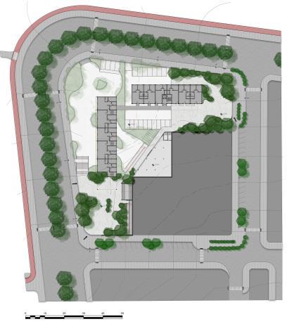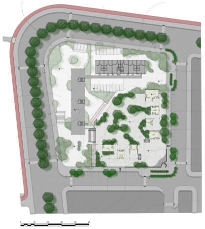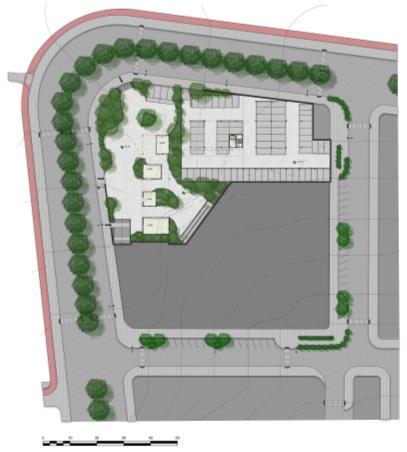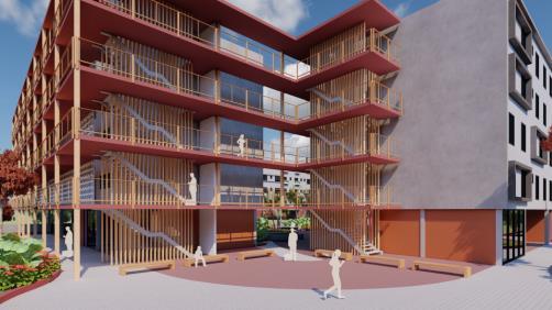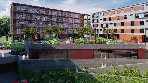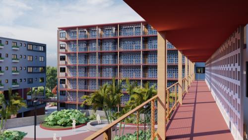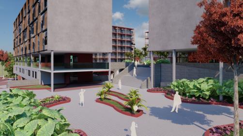 A Vila Sol Poente expõe seu partido em suas cores, formas, vegetações e espaços, portanto, pensado como um conjunto habitacional de uso misto, a quadra detalhada agrega o comércio em um andar livre, junto com o espaço habitacional Existem 4 blocos que circundam uma área central aberta para o público, uma grande praça desenhada com formas e cores expressivas que remetem ao pôr do sol. Portanto, seguindo nessa linha, o desenvolvimento do projeto definido em três platôs consegue fazer a harmonia entre o espaço público e privado.