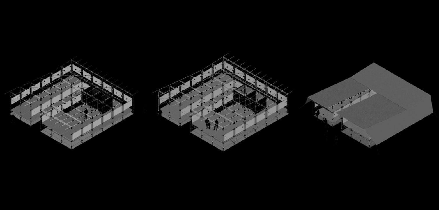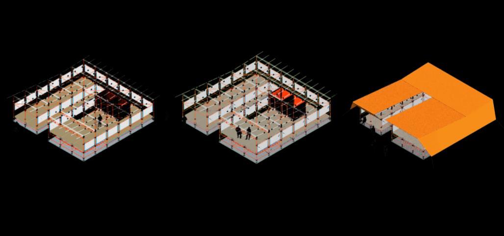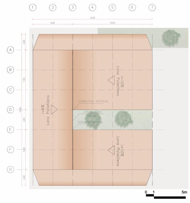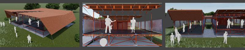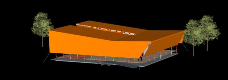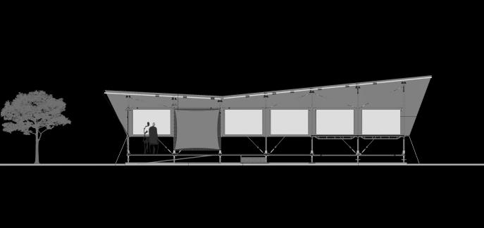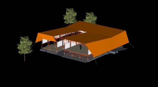 O Museu recebe uma cobertura de Lona Polietileno, devido suas características resistente, opaca e de baixo custo, a qual foi colocada no formato do tipo Borboleta, aproveitando a mesma para a calha com inclinação em direção ao vazio projetado. Com o intuito de proteger da chuva, a cobertura estende-se para além da estrutura de andaime do Museu e finca- se no solo em duas fachadas e nas outras duas, nas rosetas do andaime.