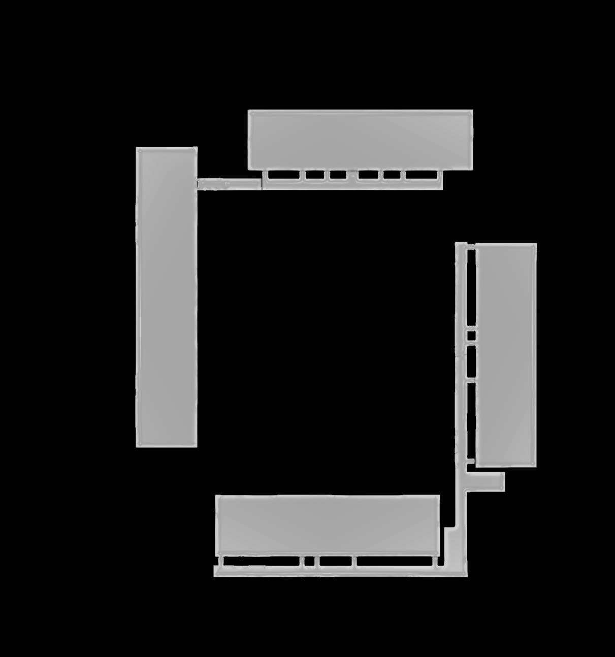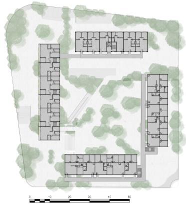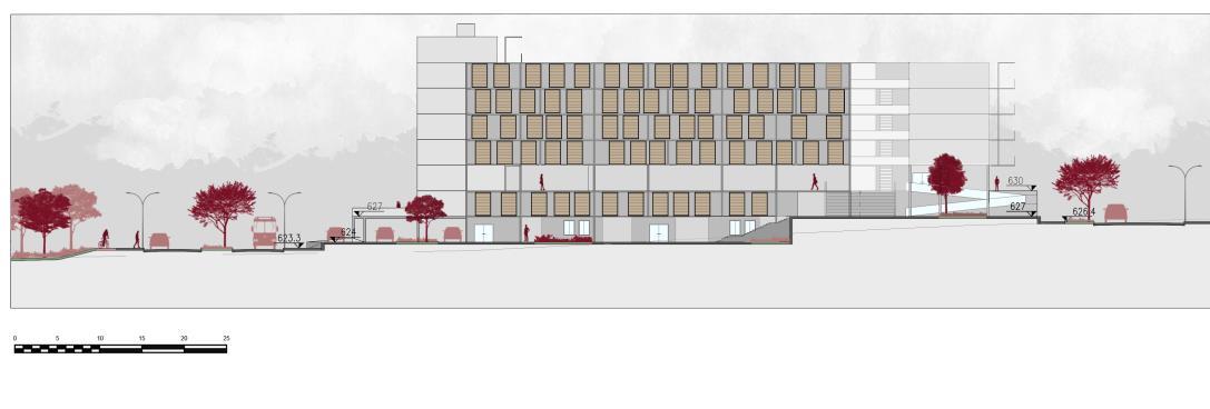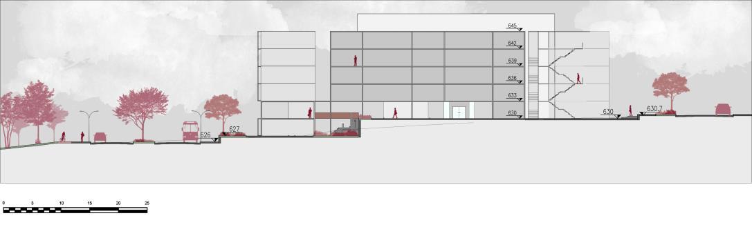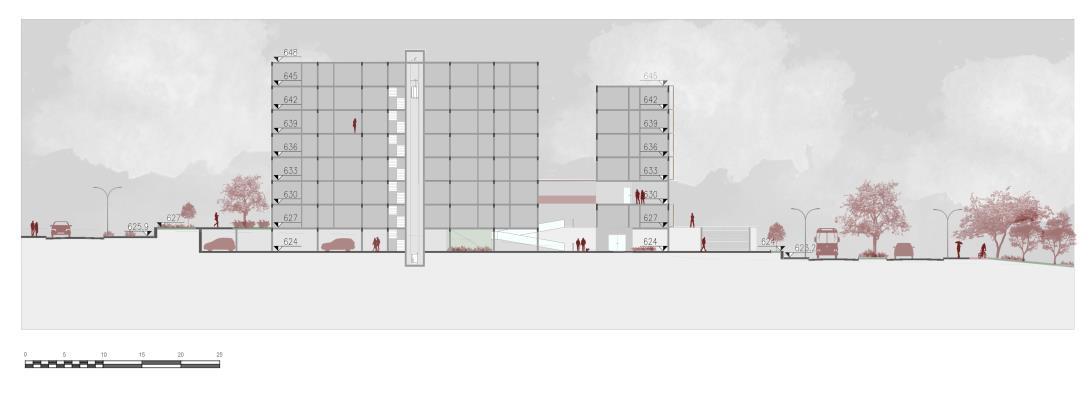 Os blocos são interligados por passarelas, ou escadas internas que são divididas para dois apartamentos E para dar continuidade e fluidez aos níveis, todos os prédios tem uma ligação em comum, seja pela passarela da cota 630 que liga ao andar livre do bloco 3, e logo ao segundo andar do bloco 4, seja pela continuidade dos platôs por toda a quadra. Existe apenas uma praça que mantém seu caráter privado, que seria a do platô 627 do lado leste, funcionaria apenas para o acesso de moradores, tendo assim também acesso às estruturas do prédio, como salão de festas, horta comunitária, e etc.