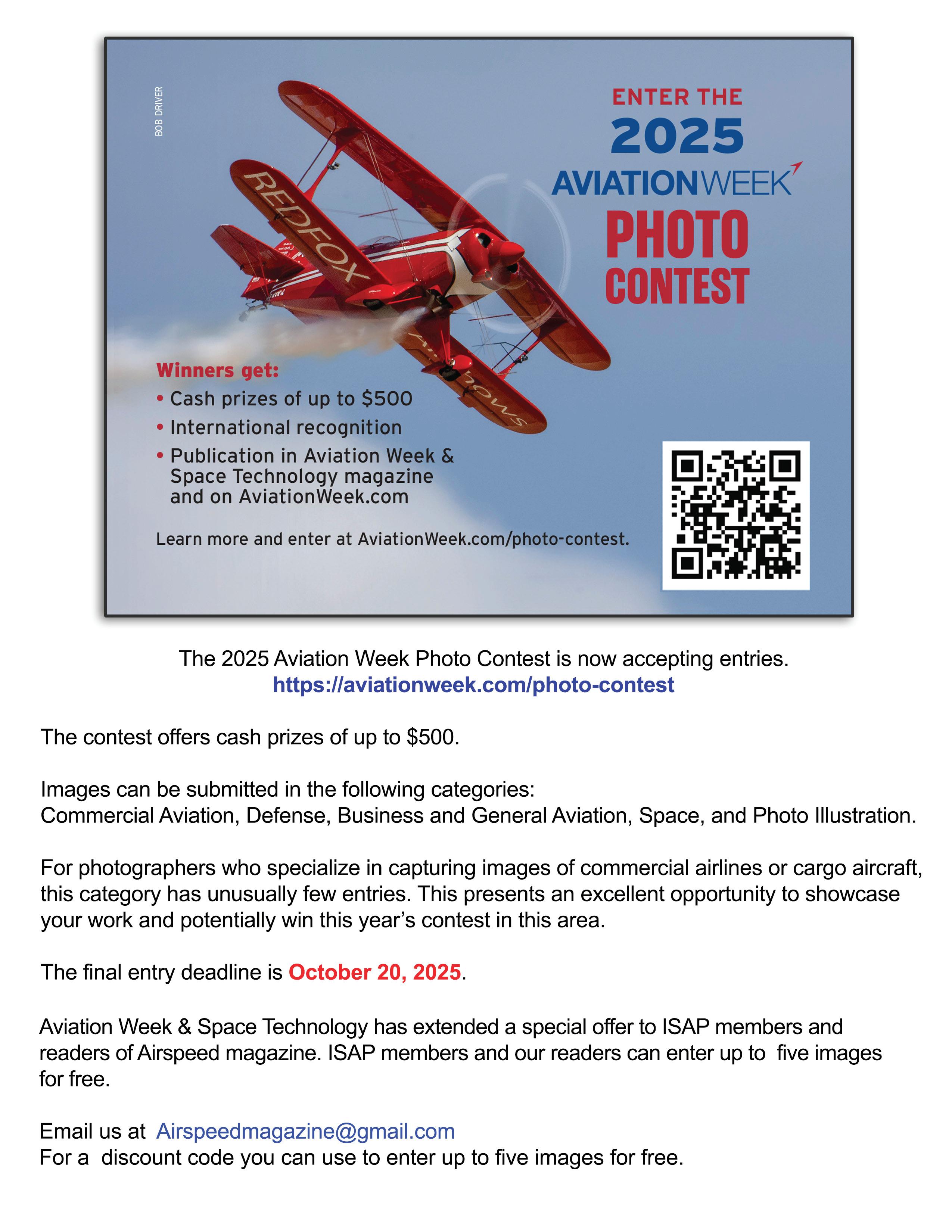 Airspeed is a periodic publication of the International Society for Aviation Photography (ISAP) and is used to communicate news, functions, convention information, and other information of interest on the local, regional, and national scenes. The views and opinions expressed in this newsletter are those of the authors and should not be construed as the views or opinions of the International Society for Aviation Photography (ISAP). Please contact us at info@aviationphoto.org