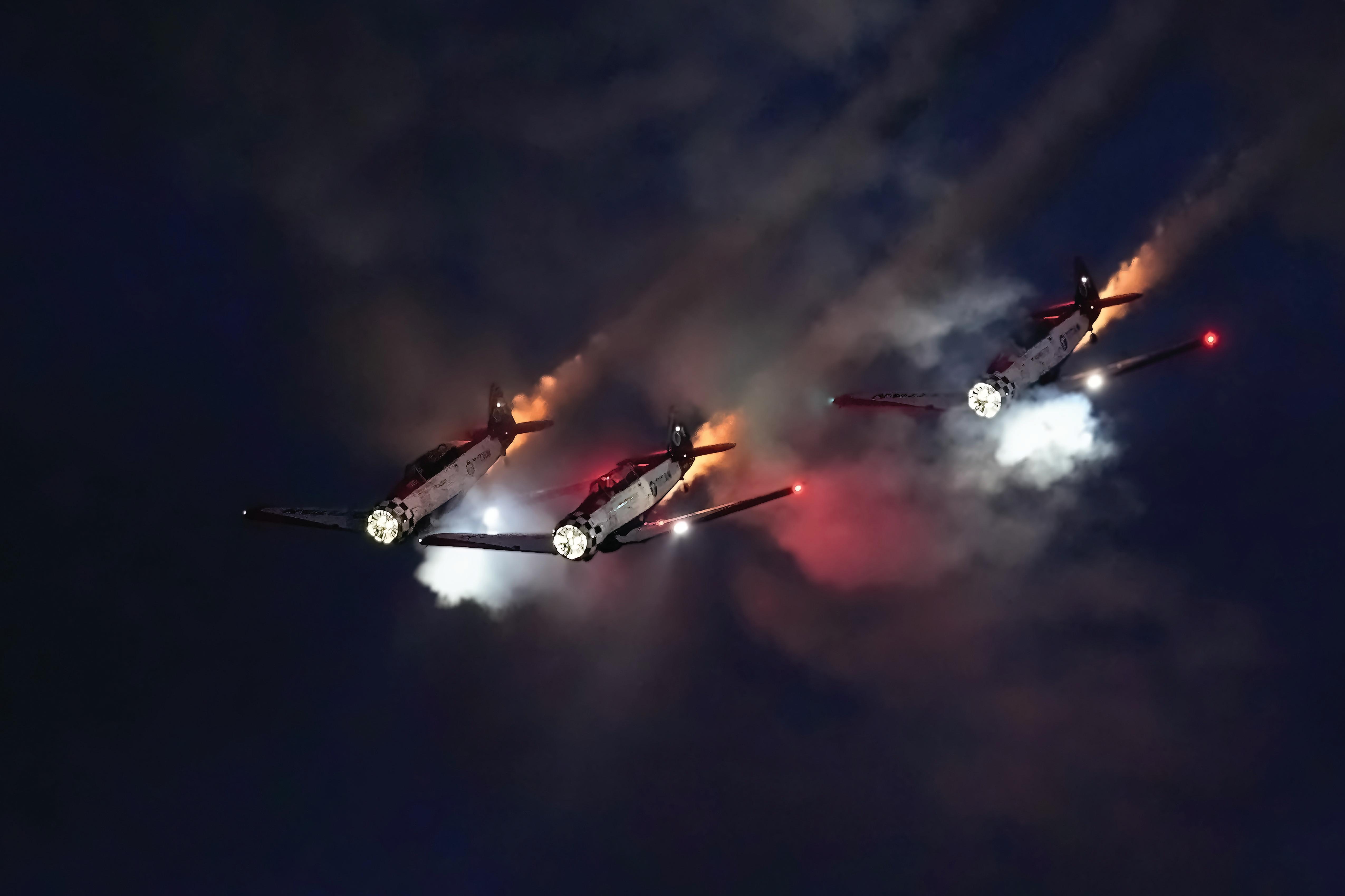 Nathan Hammond and GhostWriter Air Shows during the Saturday night air show at AirVenture. Sony 300mm f/2.8 G lens on a Sony a1m2. ISO 6400; f/2.8 at 1/200 second.