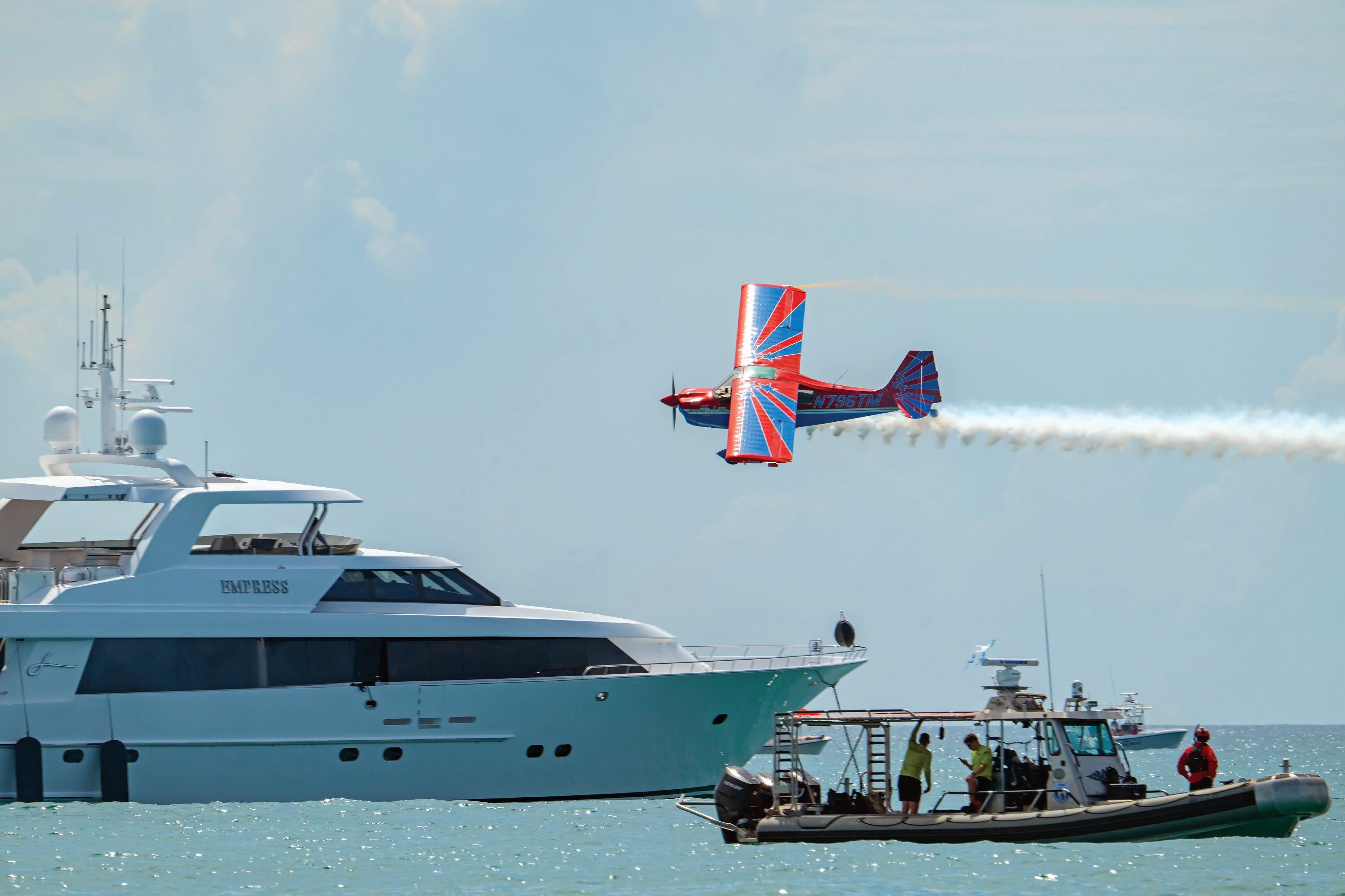 The landing zone is a section on the beach that is 300 x 300 feet with a big X to mark the spot like a treasure map. There are two team members that are stationed in the landing zone that are monitoring conditions like the air speed and direction and stay in contact with the team and crew on the plane keeping them updated to what’ s going on the ground. This is in addition to the team members on the plane tossing out a weighted marker to judge air speed and direction. All of this gets coordinated with the pilot so the jumpers can deploy and hit the landing zone target on the beach. Sound simple right?? Not so much, lots of practice and skill to hit the targets in the landing zone considering that they can jump from any where of six thousand to 14 thousand feet of a given show or program.