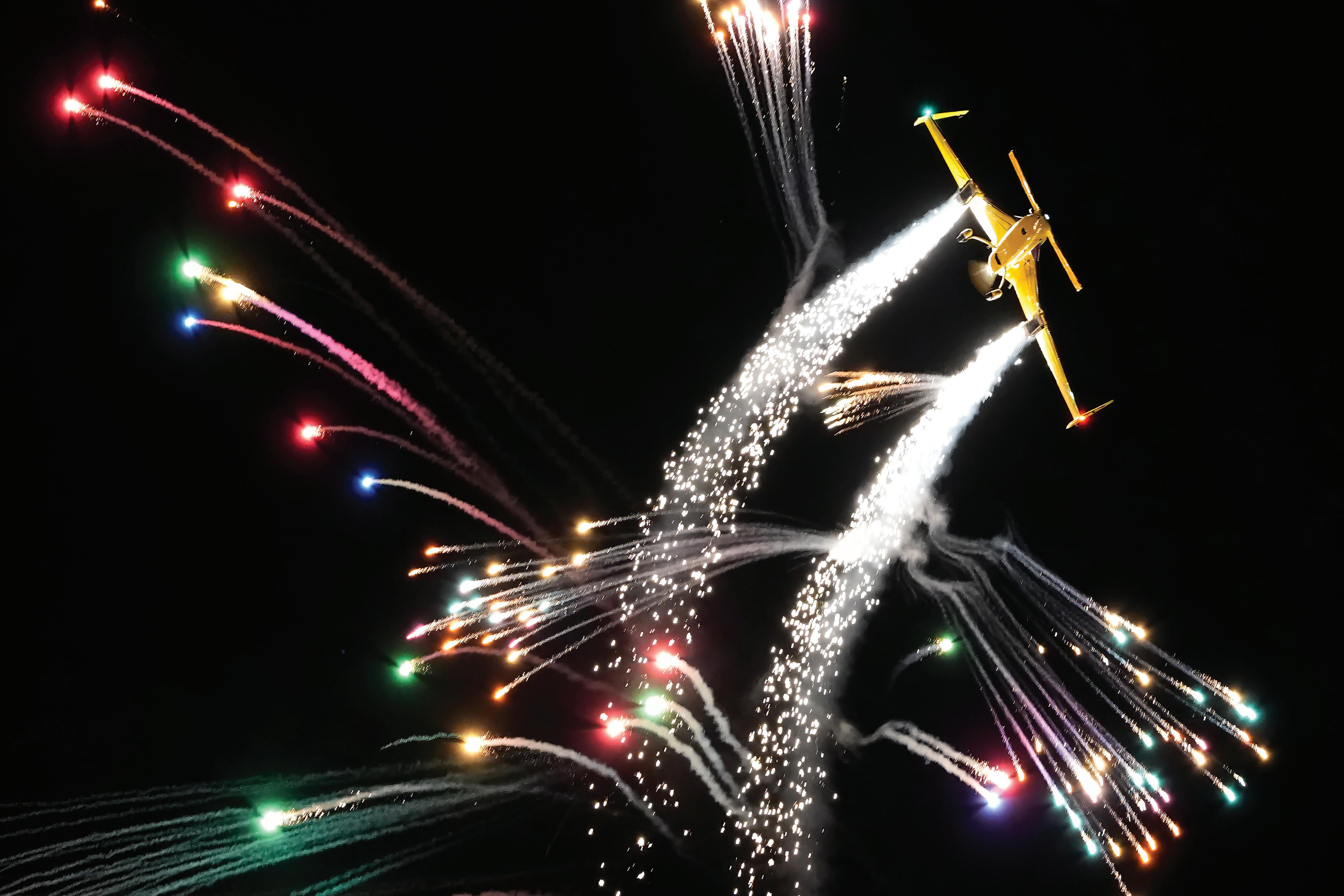 Kyle Fowler in his Go EZ lights up the Saturday night air show at AirVenture. Sony 300mm f/2.8 G lens on a Sony a1m2. ISO 6400; f/2.8 at 1/200 second.
