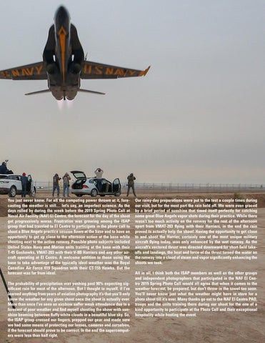 Our rainy-day preparations were put to the test a couple times during our visit, but for the most part the rain held off. We were even graced by a brief period of sunshine that timed itself perfectly for catching some great Blue Angels vapor shots during their practice. While there wasn’t too much activity on the runway for the rest of the afternoon apart from VMAT-203 flying with their Harriers, in the end the rain proved to actually help the shoot! Having the opportunity to get close to and shoot the Harrier, certainly one of the most unique military aircraft flying today, was only enhanced by the wet runway. As the aircraft’s vectored thrust was directed downward for short field takeoffs and landings, the heat and force of the thrust turned the water on the runway into a cloud of steam and vapor significantly enhancing the shoots we took. All in all, I think both the ISAP members as well as the other groups and independent photographers that participated in the NAF El Centro 2019 Spring Photo Call would all agree that when it comes to the weather forecast, be prepared, but don’t throw in the towel too soon. You’ll never know just what the weather might have in store for a photo shoot till it’s over. Many thanks go out to the NAF El Centro PAO, troops and the units training there during our shoot for the one of a kind opportunity to participate at the Photo Call and their exceptional hospitality while hosting the event.