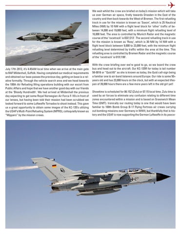 July 17th 2012, it’s 4.45AM local time when we arrive at the main gate to RAF Mildenhall, Suffolk. Having completed our medical requirements and obtained our base passes the previous day, getting on base is a relative formality. Through the vehicle search area and we head towards the 100th Air Refueling Wing operations building with our escort from Public Affairs and hope that we have another good day with our friends at the ‘Bloody Hundredth’. We had arrived at Mildenhall the previous day expecting to get some Royal Norwegian Air Force F-16’s in front of our lenses, but having been told their mission had been scrubbed we looked forward to some Luftwaffe Tornados to shoot instead. This gave us a great opportunity to obtain some images of the KC-135’s utilizing the USAF’s Multi-Point Refueling System (MPRS), colloquially known as “Mippers” by the mission crews.