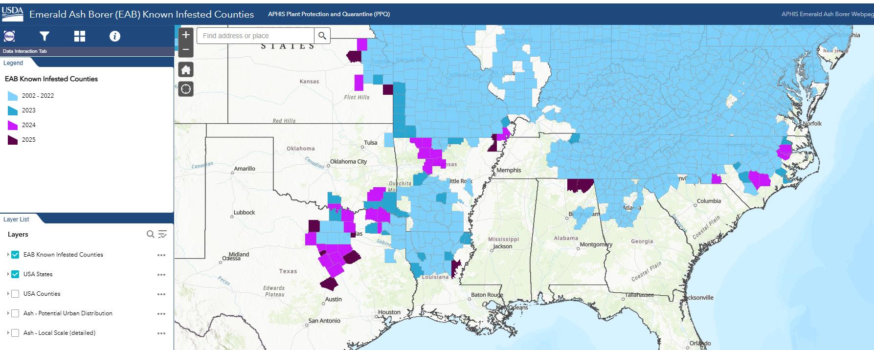 El Escarabajo Barrenador Esmeralda del Fresno (EAB), un pequeño escarabajo verde metálico, se ha extendido por todo el país desde que se avistó por primera vez en Michigan en 2002. En otoño de 2025, se confirmó su presencia en muchos estados del sur, incluidos Texas, Luisiana, Arkansas, Tennessee, Misisipi, Alabama, Georgia, Carolina del Norte, Carolina del Sur y Virginia (según el último mapa de condados infestados del Departamento de Agricultura de los Estados Unidos). Si aún no ha llegado a su condado, es probable que esté en camino.