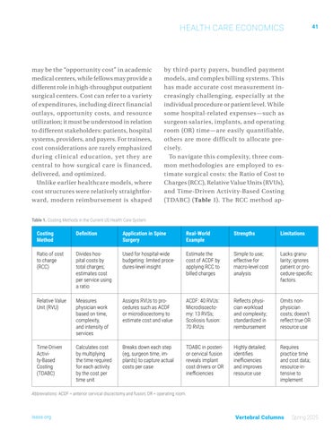 plies a standardized ratio across services to reflect institutional cost structures but lacks specificity and does not account for clinical outcomes. 3 RVUs, on the other hand, attempt to quantify the time, effort, and complexity involved in a procedure. For instance, a single-level microdiscectomy might generate significantly fewer RVUs compared to a multi-level scoliosis correction, highlighting the procedural variability inherent in spine surgery. TDABC, considered the most granular approach, calculates cost by multiplying the cost rate of a resource (eg, OR time, anesthesia, implants) by time. 3 This method is especially relevant in spine surgery, where prolonged operative times, specialized equipment, and intraoperative monitoring significantly impact resource utilization.