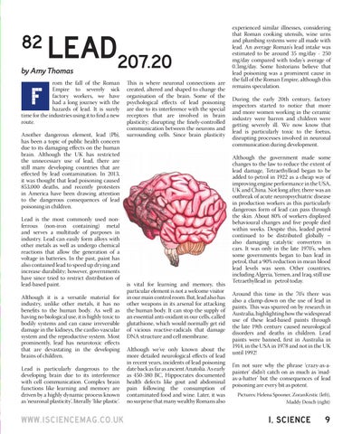 experienced similar illnesses, considering that Roman cooking utensils, wine urns and plumbing systems were all made with lead. An average Roman’s lead intake was estimated to be around 35 mg/day - 250 mg/day compared with today’s average of 0.3mg/day. Some historians believe that lead poisoning was a prominent cause in the fall of the Roman Empire, although this remains speculation. During the early 20th century, factory inspectors started to notice that more and more women working in the ceramic industry were barren and children were getting severely ill. We now know that lead is particularly toxic to the foetus, disrupting processes involved in neuronal communication during development. Although the government made some changes to the law to reduce the extent of lead damage, Tetraethyllead began to be added to petrol in 1922 as a cheap way of improving engine performance in the USA, UK and China. Not long after, there was an outbreak of acute neuropsychiatric disease in production workers as this particularly dangerous form of lead can pass through the skin. About 80% of workers displayed behavioural changes and five people died within weeks. Despite this, leaded petrol continued to be distributed globally – also damaging catalytic converters in cars. It was only in the late 1970’s, when some governments began to ban lead in petrol, that a 90% reduction in mean blood lead levels was seen. Other countries, including Algeria, Yemen, and Iraq, still use Tetraethyllead in petrol today. Around this time in the 70’s there was also a clamp-down on the use of lead in paints. This was spurred on by research in Australia, highlighting how the widespread use of these lead-based paints through the late 19th century caused neurological disorders and deaths in children. Lead paints were banned, first in Australia in 1914, in the USA in 1978 and not in the UK until 1992! I’m not sure why the phrase ‘crazy-as-apainter’ didn’t catch on as much as ‘madas-a-hatter’ but the consequences of lead poisoning are every bit as potent. Pictures: Helena Spooner, ZoranKrstic (left), Maddy Dench (right)