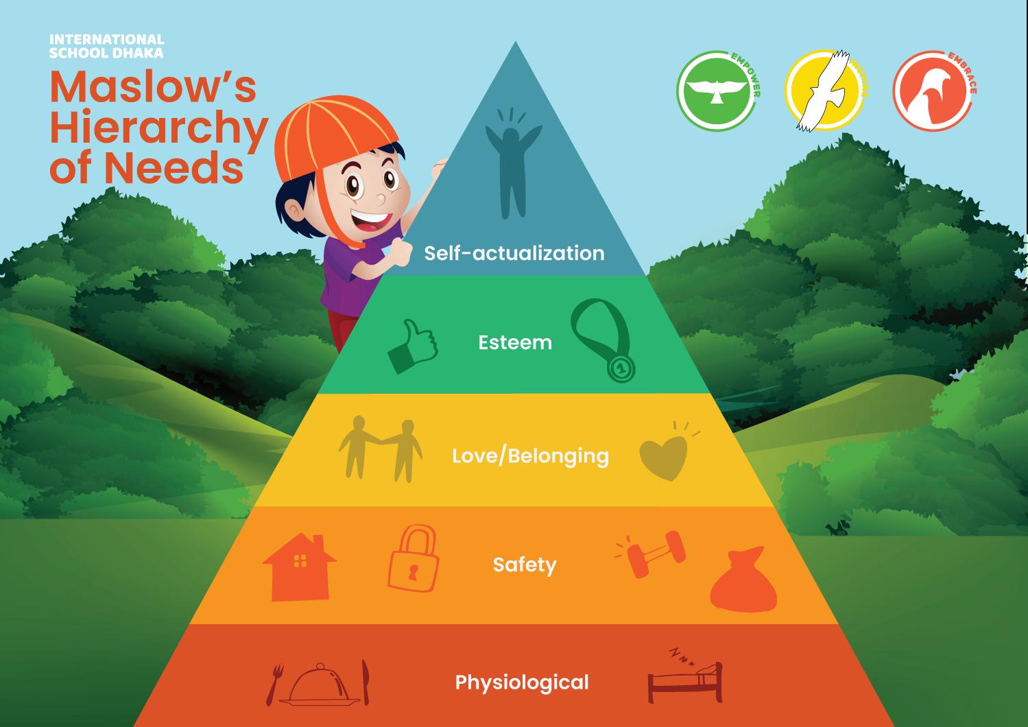 In order for a student to reach her/his full potential, Maslow (Motivation and Personality 1954) identifies a list of needs that a child has ranging from essential to more higher-level. All of the level of needs below should be addressed in order for a child to succeed in a school setting. There are actions that all invested parties can be taking in order to support the wellbeing of students at ISD that relate directly to these needs.