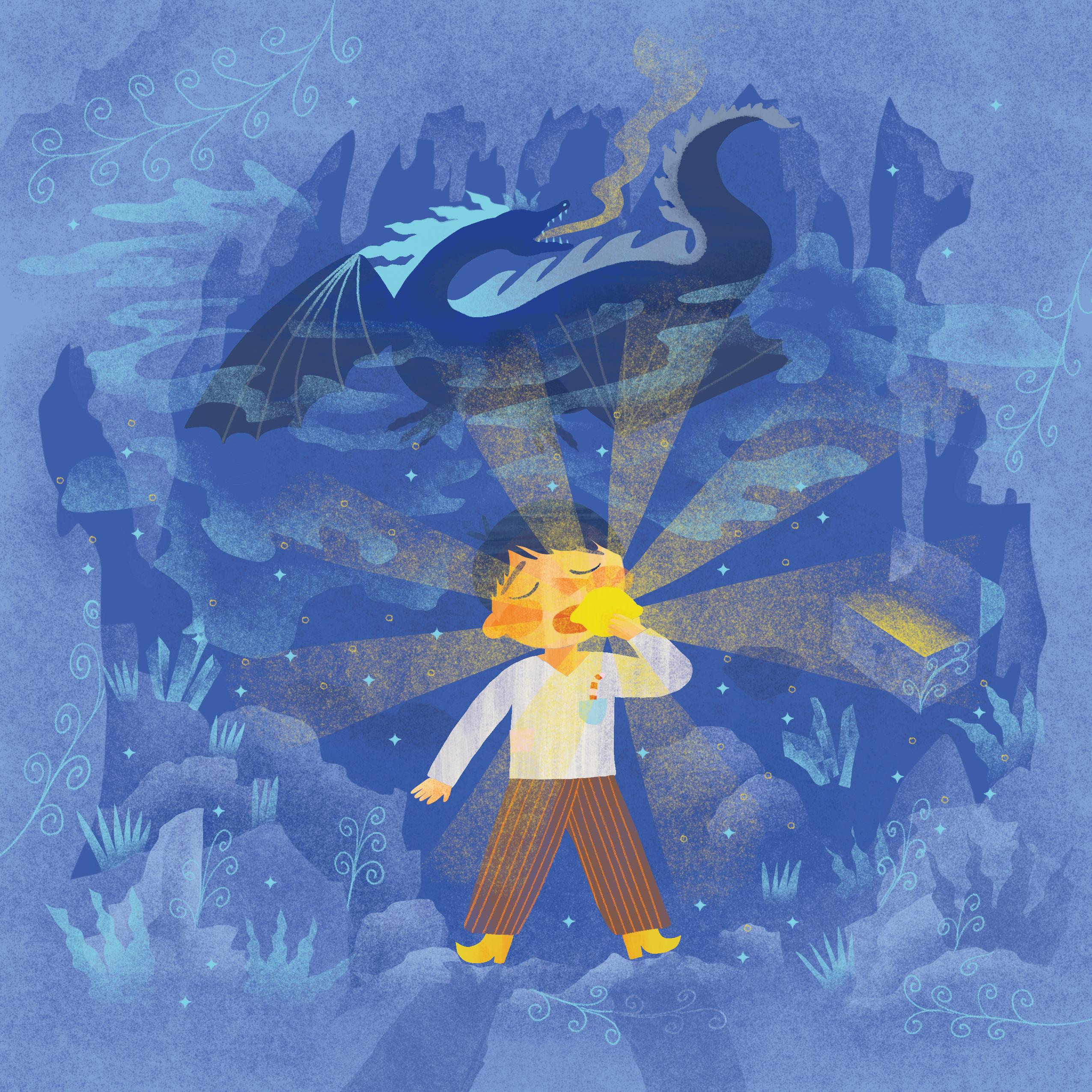 And then he realised! Normally looking into the bright light of the dragon’s eye would kill a man. But he was blind! The darkness saved him. Out of nowhere the dragon let him go. Even though Bob could not see objects his eyes could feel a light illuminate the cave. And then he knew. The lemon was what gave the dragon its immense power. The creature was recharging! He frantically leapt towards the citrusy smell. He felt for the lemon in his shaking hands. He found it and picked it up and... ATE THE LEMON!!!! He flinched at its super sour taste. And with a bonebreaking roar of anguish, the Light Dragon threw its head against the ceiling and collapsed onto the floor.