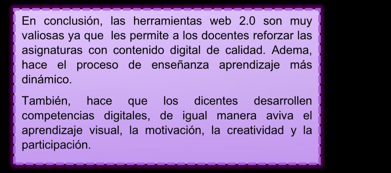 Con la aplicación y utilización de estas herramientas en la nueva era de la tecnología como docentes se busca que la interacción de los estudiantes sea mas didáctica y activa además, esto les permite desarrollen su creatividad y habilidades por otro lado se generan contenido de interés de igual manera que colaboreneinteractúenentresitodoestodemaneravirtual.