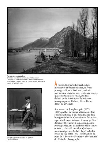 l’issue d’un travail de recherches historiques et documentaires, ce fonds photographique a livré une partie de son mystère et donné sens et vie aux images qui constituent désormais, au-delà de leur qualité artistique, de précieux témoignages sur l’Isère et Grenoble au début du 20e siècle. Son auteur est Joseph Apprin (18591908), greffier de justice à Grenoble, dont l’épouse est issue d’une famille aisée de la bourgeoisie locale. Cette aisance financière a permis de toute évidence à notre greffier de laisser libre cours à sa passion pour la photographie, qui est alors un passe-temps onéreux, réservé à une élite. Quelques scènes ont permis de dater la période des prises de vue entre 1890 (construction du pont de la Porte-de-France) et 1908 (année du décès du photographe).