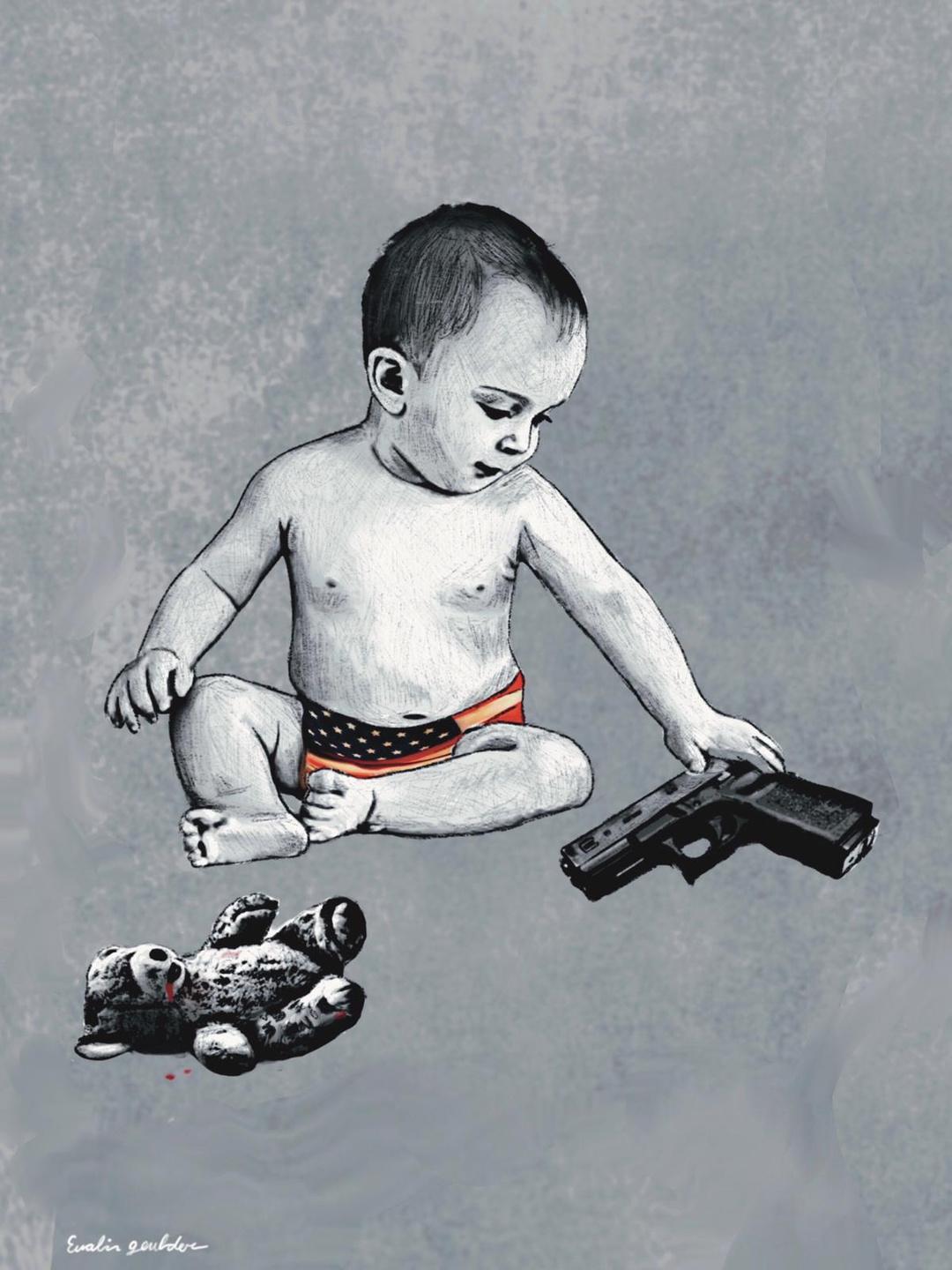 After reading the recent news of a 6 year old first grader bringing a loaded gun to school and shooting a teacher, I felt compelled to create a piece that represents the absurdity of the gun laws and culture in the United States of America The baby is reaching for a gun instead of his teddy bear and inadvertently shoots his toy This represents the 377 unintentional shootings by children in America in 2021