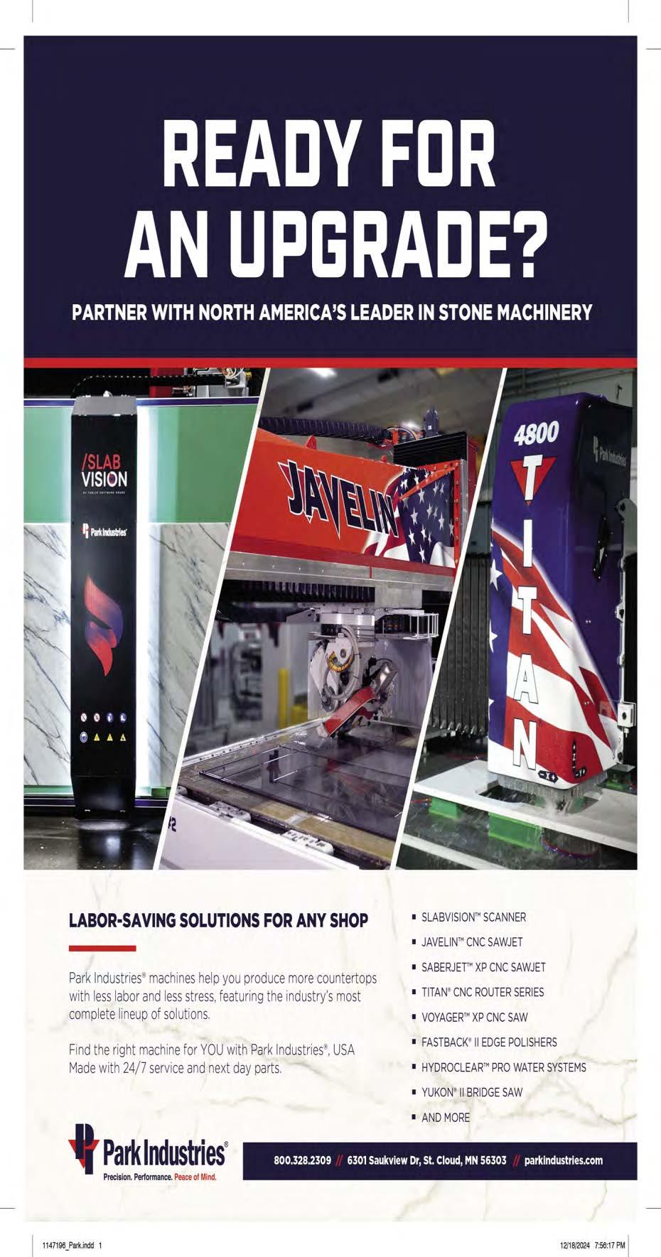 digital templating devices from Laser Products and 5th Gear. We saw digital scanning options from Helios and D2, new water jet CNC cutting solutions such as the Baca M Series and the Park Javelin, along with the new Paladin CNC edge polishers from BBM. There were new tools that help reduce airborne respiratory crystalline silica particles (RCS) which cause silicosis, including air scrubbers and respirators from BBI and Gran Quartz. Many new and innovative surfaces that contain less RCS and still have the properties that we know are inherent to the value of the quartz products were introduced by Cosentino, Daltile and others. On the design side, we saw translucent properties of quartz from Cambra’s new introductions. These are just a few of the exciting innovations that were on display this year. The new designs and product innovations continue to evolve new and exciting opportunities for our industry and will help drive growth in the countertop segment of the economy.