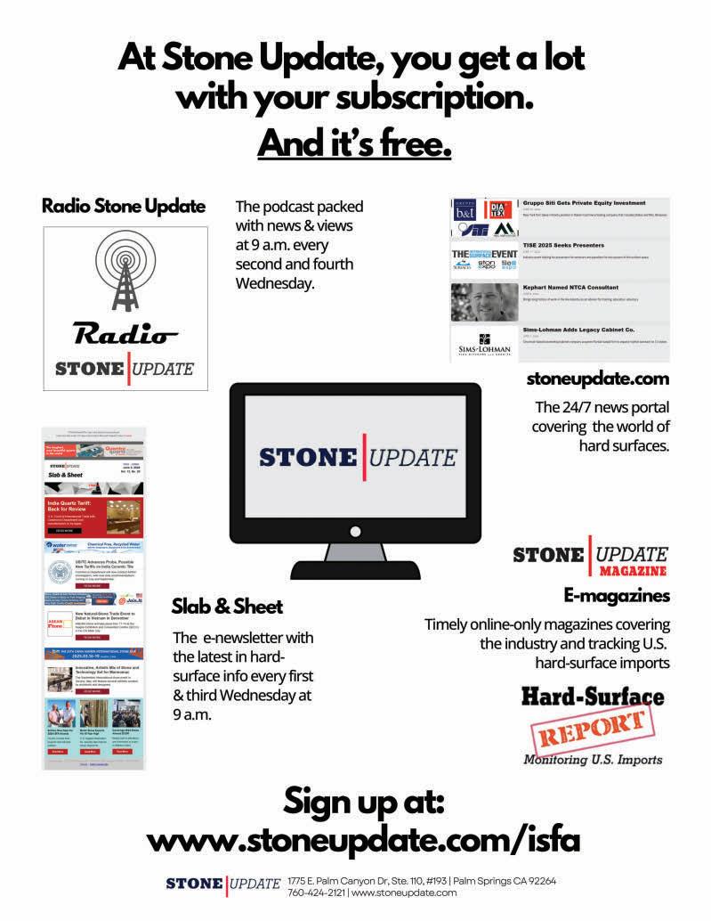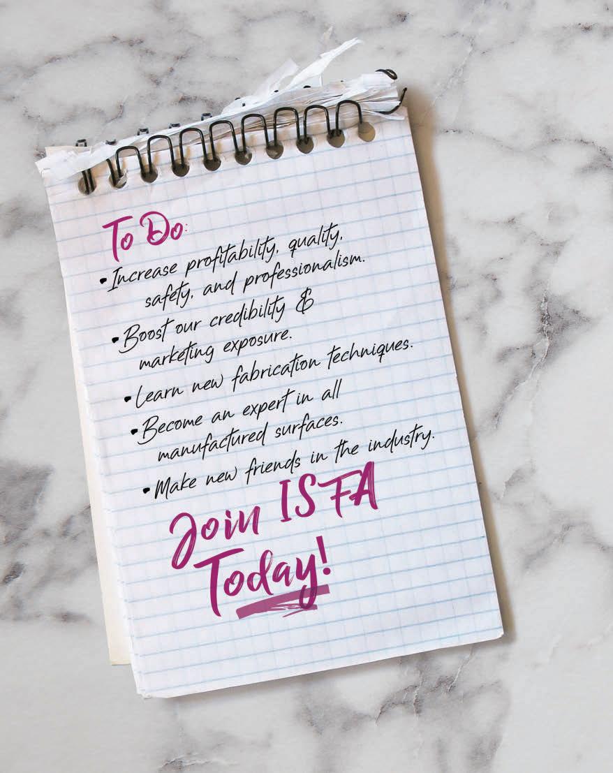 Countertops & Architectural Surfaces magazine is proudly printed in the United States of America. Copyright © International Surface Fabricators Association 2025. All rights reserved. No part of this publication may be reprinted or otherwise reproduced without the publisher’s written consent.