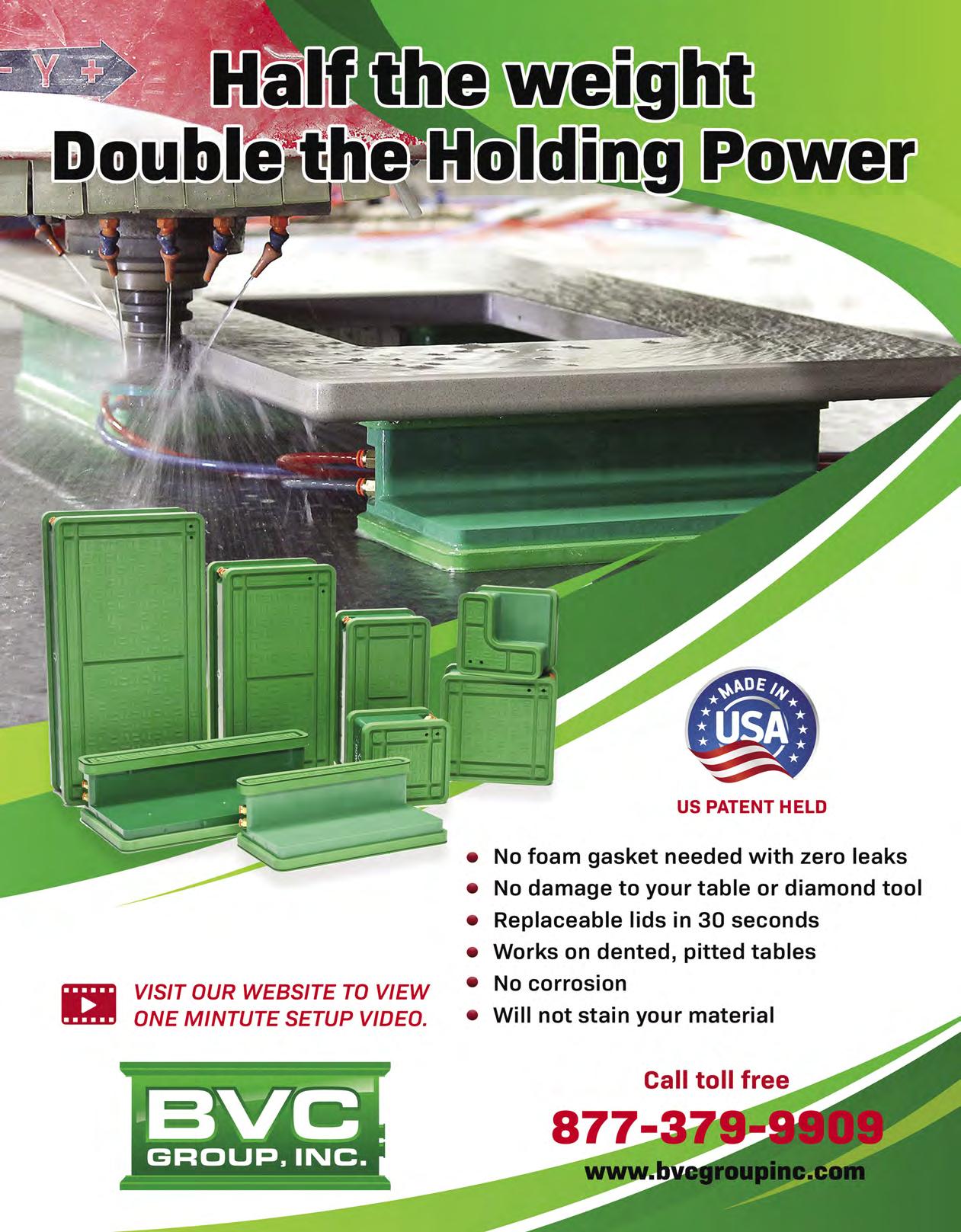 It’s hip to be square! Or is it?! Once again, the stone fabricators spoke and Better Vacuum Cups was listening. So here is the all-new 200 mm round cup from BVC. This cup comes in three heights of 105 mm, 150 mm and 200 mm for all new double-stacked tooling. As with all SS cups from BVC, this SSR200 is half the weight, and many customers are reporting double holding power for faster setup times. For more information, check out all the BVC videos at www.GREENBVC.com.