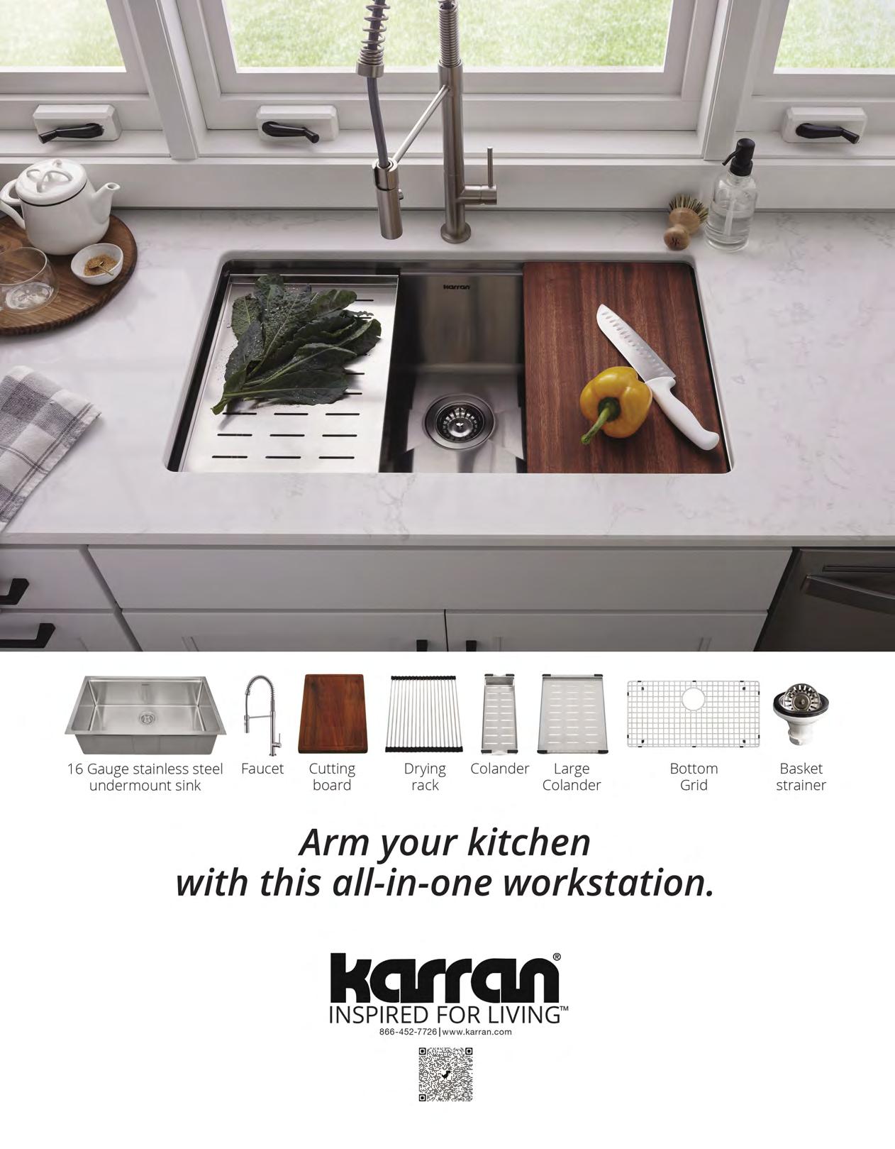 Karran’s new Scottsdale faucet comes in five beautiful finishes with gunmetal grey shown here, proving to be a prevalent choice with consumers. This pull-down, commercial-style faucet features a ceramic cartridge, a durable PVD finish and a practical dual-function spray head. Simple to install with its single-hole design, this new model is part of a collection of six new faucets introduced by Karran this year. For more information, visit www.karran.com.
