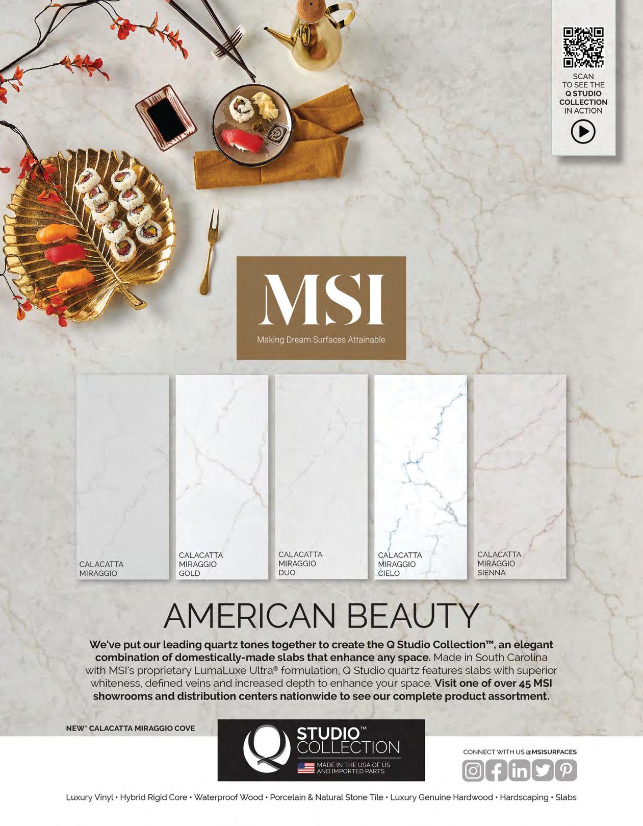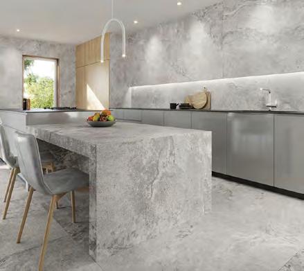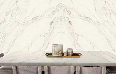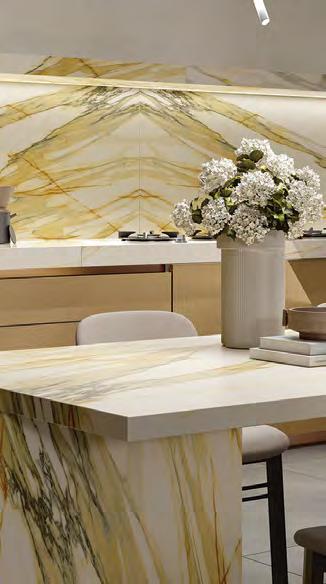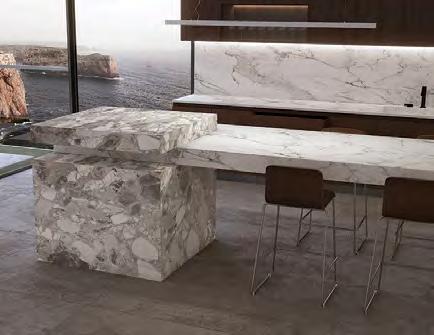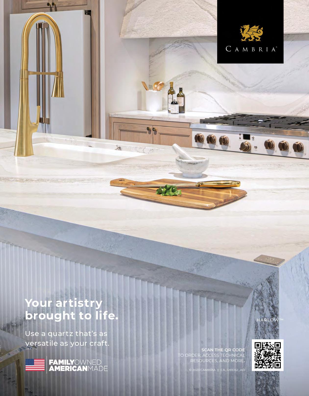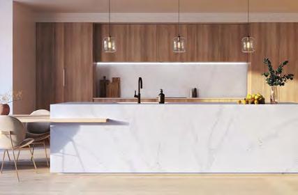 The ENVI Quartz and Porcelain slab collections represent a turnkey brand solution for savvy trade professionals. Backed by their concierge support team and comprehensive merchandising program, each brings together the world’s most on-trend looks, crafted by their handselected group of dedicated producers. Expansive and always evolving, these marketdefining collections now encompass 40 quartz and 40 porcelain selections. Recent quartz additions include eight brand-new, on-trend colorways: Cristall, Tiffany Gold, Venetian Lace, Matera, Galena, Palazzo, Waterfall and Alpine Blu. Guided by decades of industry experience, the ENVI team ensures every slab meets our exacting specifications, performance requirements and high-value expectations. You can rely on ENVI Surfaces to help your customers create the environments they envision — spaces everyone will admire. Pictured here is a sleek, contemporary kitchen showcasing the classic aesthetic of ENVI Cristall. For more information on both ENVI quartz and porcelain collections, visit www.envisurfaces.com.