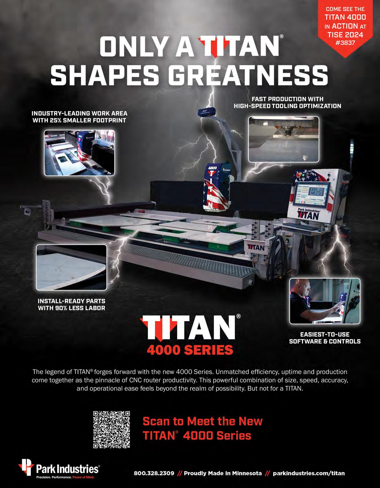 The legend of TITAN forges forward with the new 4000 Series. Unmatched efficiency, uptime and production come together as the pinnacle of CNC router productivity. This powerful combination of size, speed, accuracy and operational ease feels beyond the realm of possibility. The new TITAN 4000 series features swift rapid speeds and high-speed tooling optimization. Produce installation-ready parts straight from the industry’s easiest-to-operate CNC router and save 90% on labor. With the largest work area in the industry, the TITAN 4000 Series is now in a compact design that takes up 25% less floor space. TITAN 4000 Series is the most productive way to finish countertops, vanities and more. Learn more at www.parkindustries.com/titan.