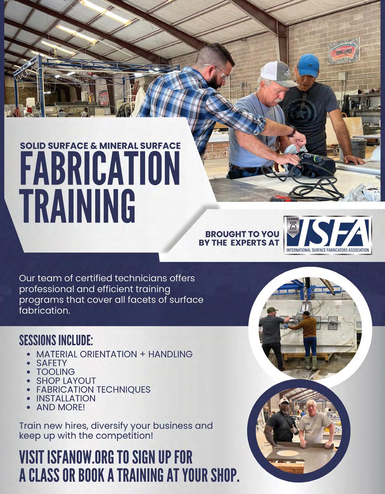 Photos in this publication may not depict proper safety procedures for creative purposes. ISFA and Countertops & Architectural Surfaces magazine support the use of proper safety procedures in all cases and urge readers to take steps to institute such procedures.