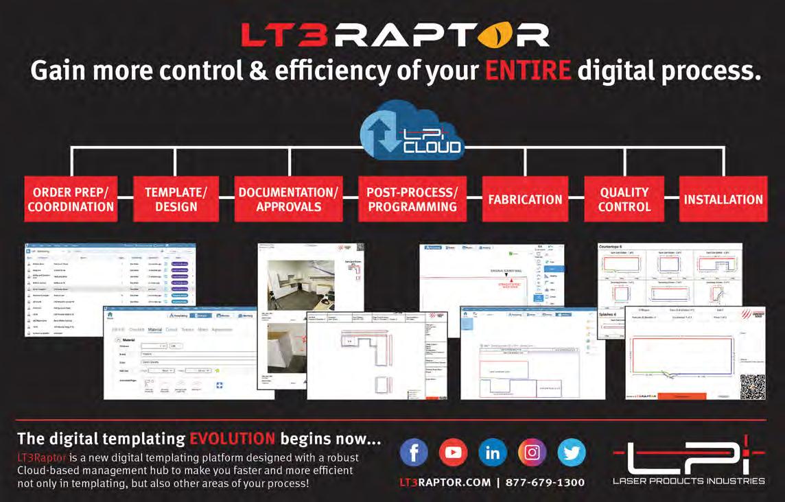 LT3Raptor is a new digital templating platform designed with a robust cloud-based management hub to make you faster and more efficient not only in templating, but also other areas of your process including job management, programming and more. LT3Raptor has built-in Templating Intelligence to make quick even quicker. From Edge Detection to One-Touch technology, finish fabrication-ready files in fewer clicks easily and intuitively. LT3Raptor has taken the user-friendly foundation of the current LT software and enhanced it. The new UX and UI feature workspace customization, improved Quick Actions and more. This management hub enables you to view and manage jobs, edge styles, drop-ins, user permissions and workflows. If you are interested in learning more about LT3Raptor, visit www.lt3raptor.com.