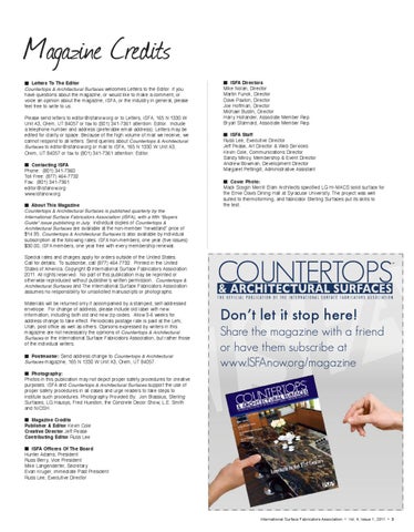 Magazine Credits Letters To The Editor Countertops & Architectural Surfaces welcomes Letters to the Editor. If you have questions about the magazine, or would like to make a comment, or voice an opinion about the magazine, ISFA, or the industry in general, please feel free to write to us. Please send letters to editor@isfanow.org or to Letters, ISFA, 165 N 1330 W Unit A3, Orem, UT 84057 or fax to (801) 341-7361 attention: Editor. Include a telephone number and address (preferable email address). Letters may be edited for clarity or space. Because of the high volume of mail we receive, we cannot respond to all letters. Send queries about Countertops & Architectural Surfaces to editor@isfanow.org or mail to ISFA, 165 N 1330 W Unit A3, Orem, UT 84057 or fax to (801) 341-7361 attention: Editor. Contacting ISFA Phone: (801) 341-7360 Toll Free: (877) 464-7732 Fax: (801) 341-7361 editor@isfanow.org www.isfanow.org About This Magazine Countertops & Architectural Surfaces is published quarterly by the International Surface Fabricators Association (ISFA), with a fifth “Buyers Guide” issue publishing in July. Individual copies of Countertops & Architectural Surfaces are available at the non-member “newstand” price of $14.95. Countertops & Architectural Surfaces is also available by individual subscription at the following rates: ISFA non-members, one year (five issues) $30.00; ISFA members, one year free with every membership renewal.