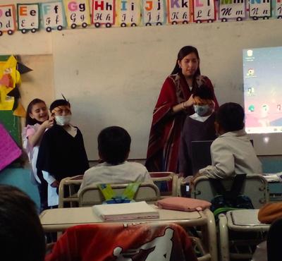 En la primera clase trabajé con las viviendas y vestimentas de los diaguitas. Para trabajar la primera usé como recurso didáctico el proyector (que, para mí sorpresa, por la reacción de los estudiantes, no lo conocían). Por medio de este recurso presenté el mapa de la Argentina para que conozcan qué provincias ocupó esta comunidad, también mostré imágenes de las viviendas de los diaguitas y les expliqué sobre los materiales que utilizaban para construirla y mediante preguntas orientadoras los llevé a reflexionar sobre las diferencias y semejanzas con las casas del presente. Luego trabajé con la vestimenta de los diaguitas, pero para ello me vestí, junto con los estudiantes, con ponchos y plumas como lo hacía esta sociedad.