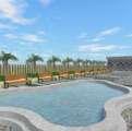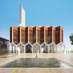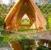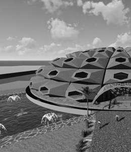 Asphericalbuildingactsasa mandalorglobesurrounded bywaterfeatures.