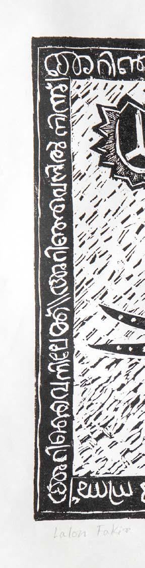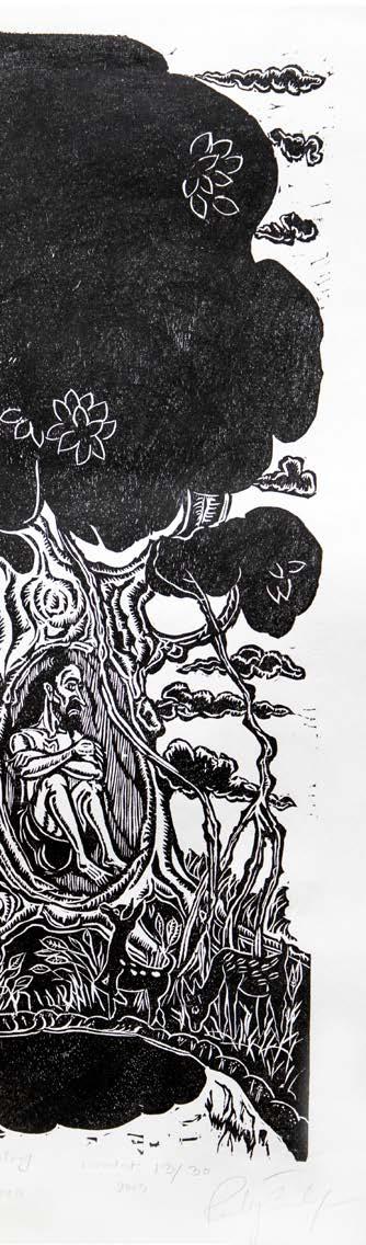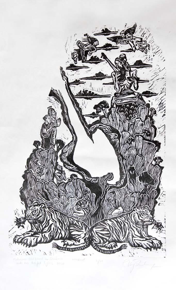 Mahaguru Atalbihari Sai Darbesh with his two pet tigers, 2021 18 x 12.2 inch Woodcut,