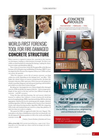 WORLD-FIRST FORENSIC TOOL FOR FIRE-DAMAGED CONCRETE STRUCTURE When concrete is exposed to intense fire, materials in the concrete can decompose, leading to a deterioration of strength. Yet there is no widely accepted method of evaluating this damage, making the choice between repair and demolition difficult. Now a team of researchers, led by Dr Youngsun Heo of the Korean Institute of Civil Engineering and Building Technology (KICT), have developed the Fire Forensic Investigation of Structure (F2IS) tool that can answer the question. “After fire exposure, service life of concrete structure can drop within two weeks, depending on the damage level,” says Heo. “The higher the volume of pores in concrete arising from fire, the faster the dramatic reduction of life expectancy. If the structure isn't going to be rebuilt, immediate diagnosis and subsequent repairing work should be proceeded even when there's minor damage.” By taking tiny 1-2g samples for every 10mm of depth of fire-damaged concrete, F2IS can predict the impacts of the fire – such as temperature, length of time spent in the heat and how heat diffused through the structure – with 80% accuracy. Using this data and deep learning, the tool assesses which key features to address that embrace a series of protocols involving practical sampling design (PSD), experimental design (ED) for selecting appropriate chemical devices for analysing specific samples, chemical profiling algorithm (CPA) for singling out key features from chemical results; and a deep learning interface algorithm (DIA) for comparing CPA results and standard data pre-stored in a large data platform. It takes less than two weeks to complete. The patent for F2IS was approved earlier this year (August). The team plans to develop a rehabilitation system that can chemically cure the decomposed hydration products to fill in the cracks and help the structure recover. Citations: Concrete Institute of Australia and Cosmos (Above, from left): With a portable hand-drilling device, samples of only 1-2g are being taken at every 10mm depth, up to 40mm so that the least damage to the concrete specimen is achieved.
