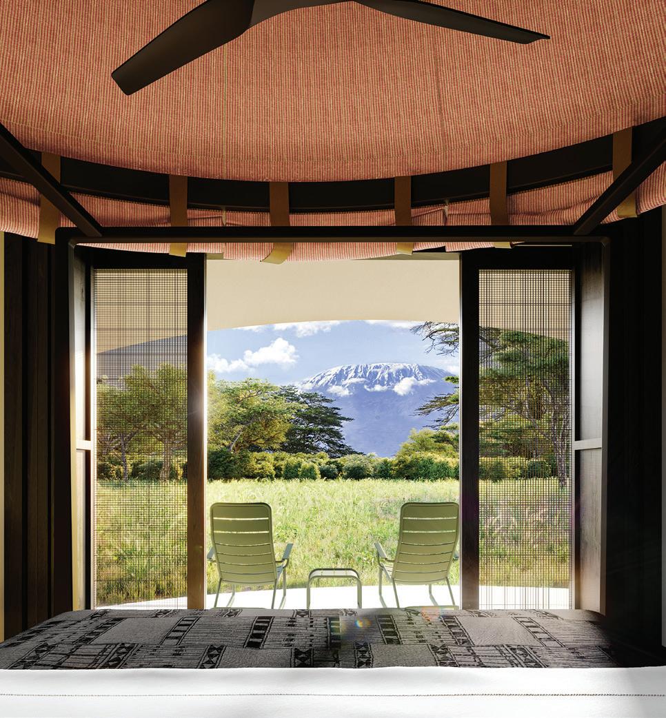 shower. To maximise the views of Kili, each suite has floor-toceiling screened doors leading to a private deck with a shaded lounge area, an outdoor shower and, of course, Angama’s signature rocking chairs, perfect for mountain-gazing. “The challenge has been to design appropriately for this ecosystem and this guest experience, and to find the right amount of what our guests really want,” says Mitchell.
