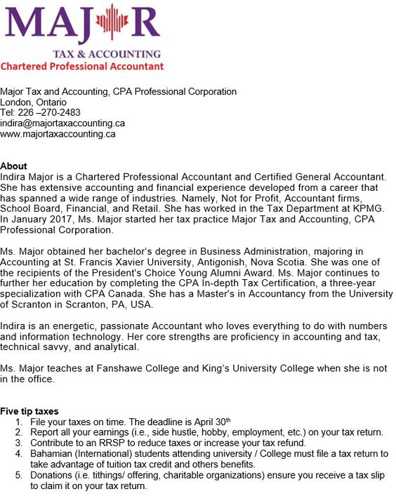 BelowaresomeusefultaxtipsandadvicefromIndiraMajor,CPA,CGA,afellowBahamian,whoisalsoatax accountantinOntario.Specialbonus!Thefirst5personstocontactNABC(info@nabcandfriends.com)foraspecial discountcodewillgeta20%discountonpersonaltaxpreparationserviceswithMajorTax&Accounting.Actfastto getyourdiscountcode!