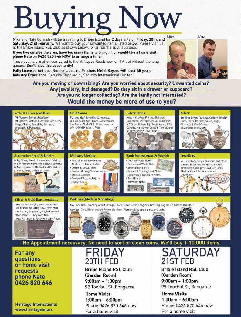 In today's trend of downsizing and decluttering our homes, it's the perfect time to go through those drawers and cupboards and turn those unwanted items into cash. Antique Buyers, and father-son duo, Mike and Nate, will be at Bribie Island RSL Club on Friday, 20th and Saturday, 21st of February, from 9am to 1pm both days. See page 7 for full details.