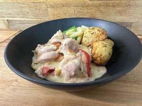 Tender roasted chicken served with gravy, roast chat potatoes, pumpkin and green beans.
