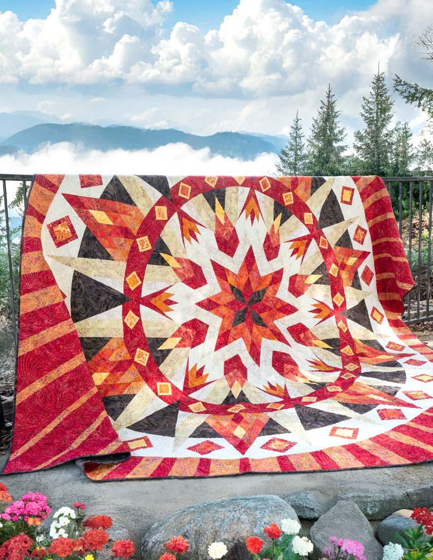 “Although the “Southwest Starburst” has an intricate design, the piecing techniques can be mastered quickly! Throughout the project, piecing is done using an oversized technique that is then trimmed to be the perfect size. This makes for very successful construction. Half square triangles will be mastered with the help of the Bloc Loc rulers. Quilters will have the option of doing the Queen size or two other sizes.”
