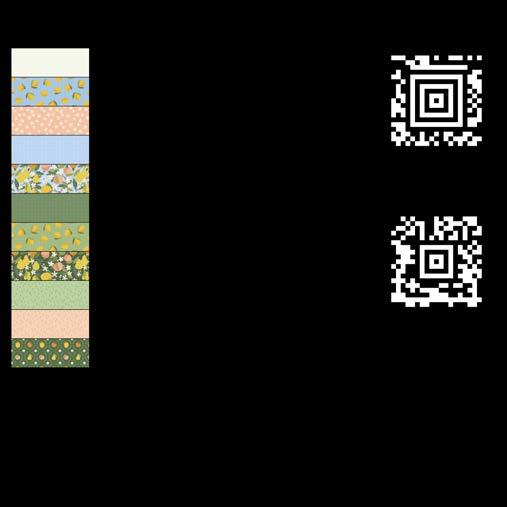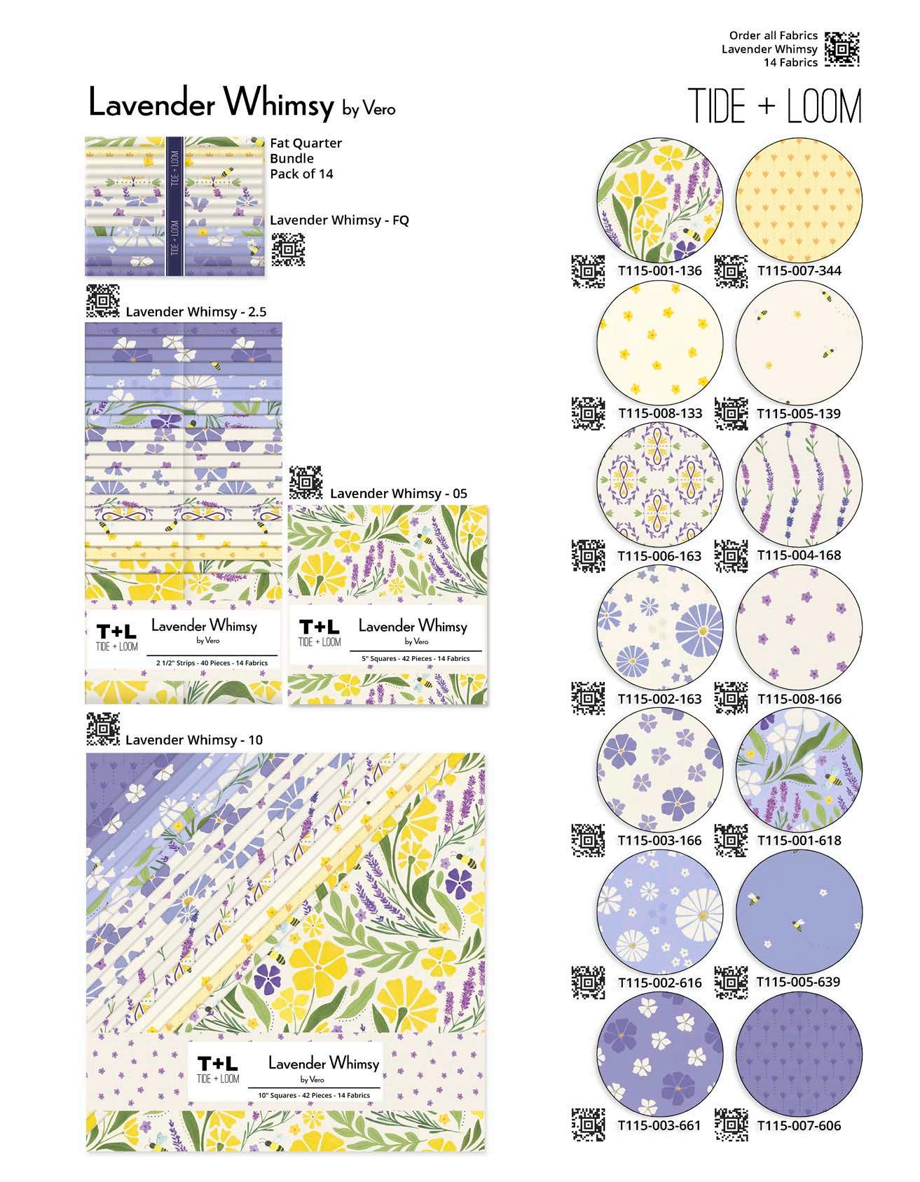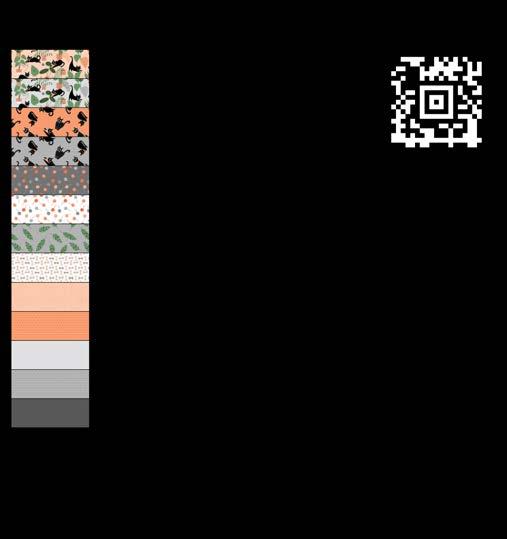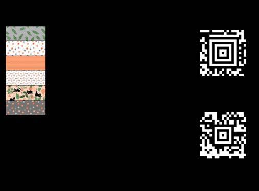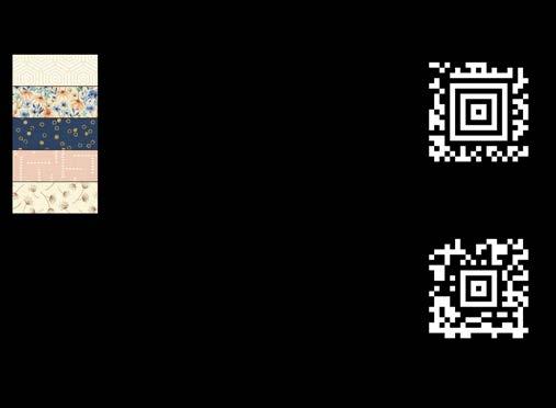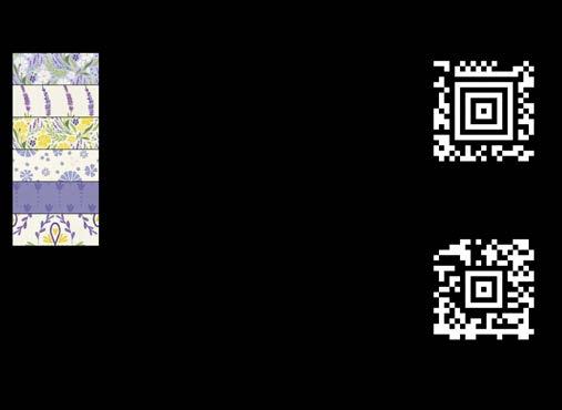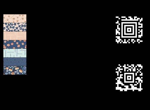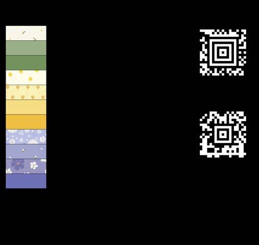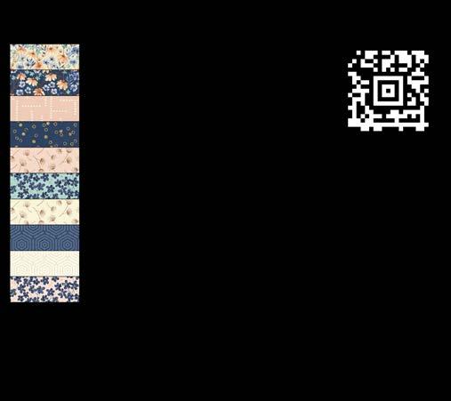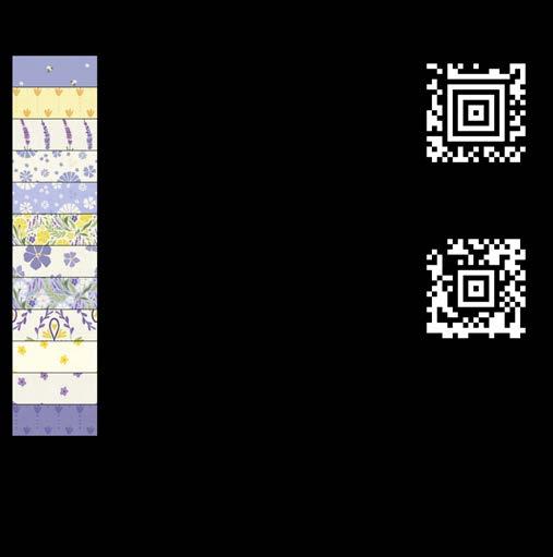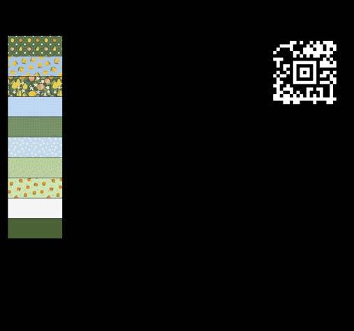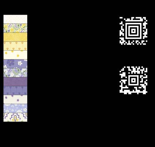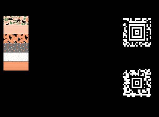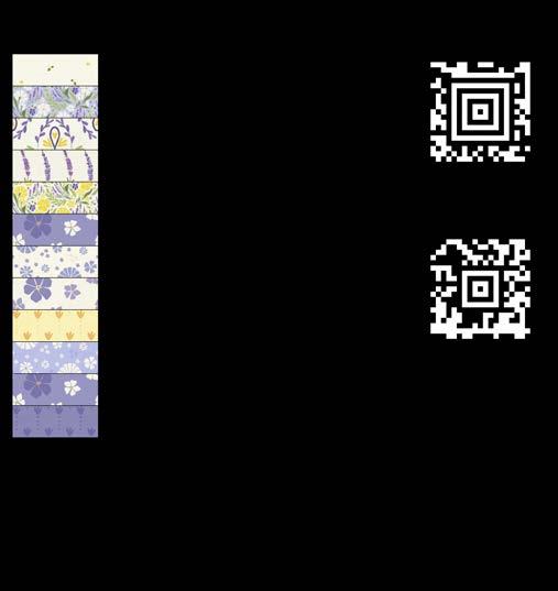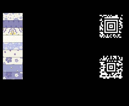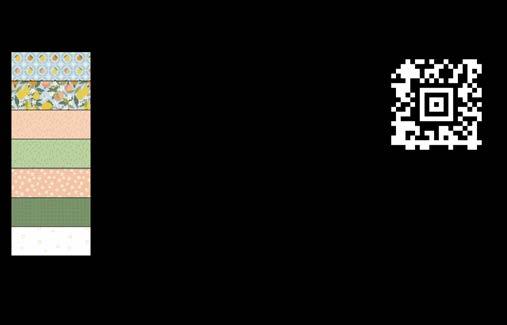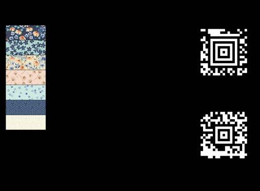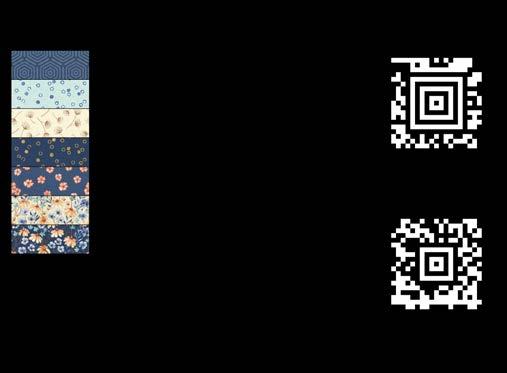 Designer projects are shown with yardage charts and QR codes. “Order All Fabrics” QR code will order all of the fabrics in the chart to meet the yardage requirements for the number of kits the shop would like; the shop will be given the option to include or exclude Backing and Binding fabrics. If a Backing or Binding fabric is a SKU that has been repeated elsewhere in the chart, a second bolt will be placed on order. Yardages will not be added together. Large continuous cuts may require additional bolts.