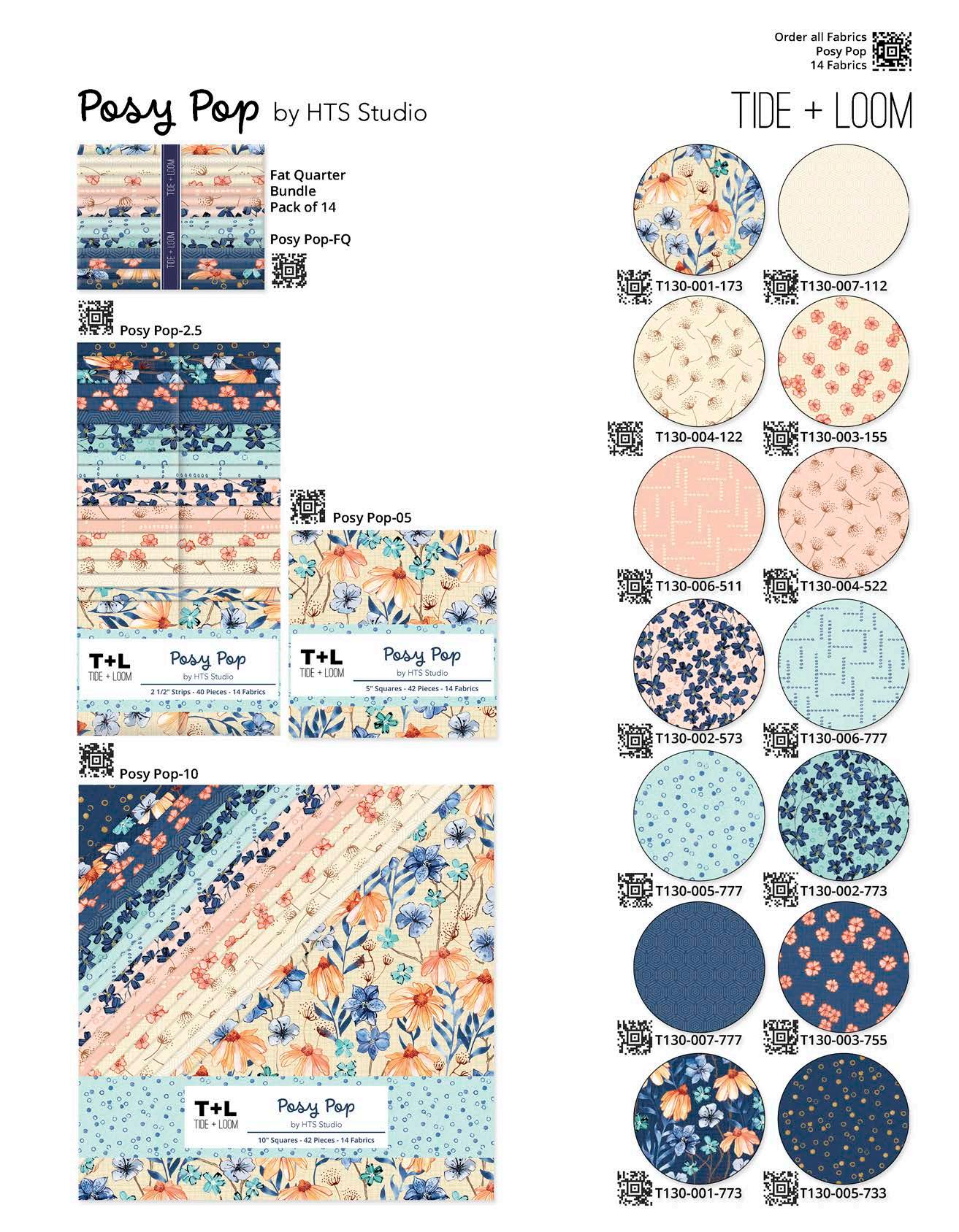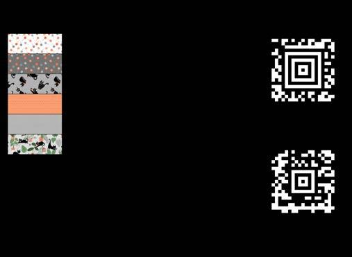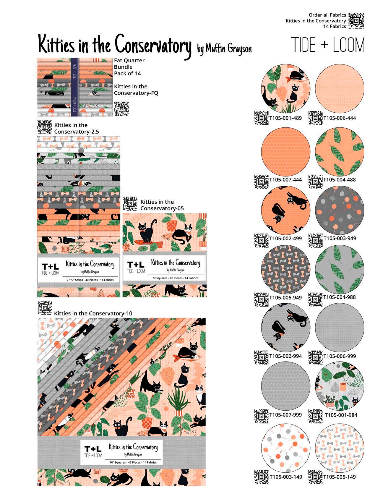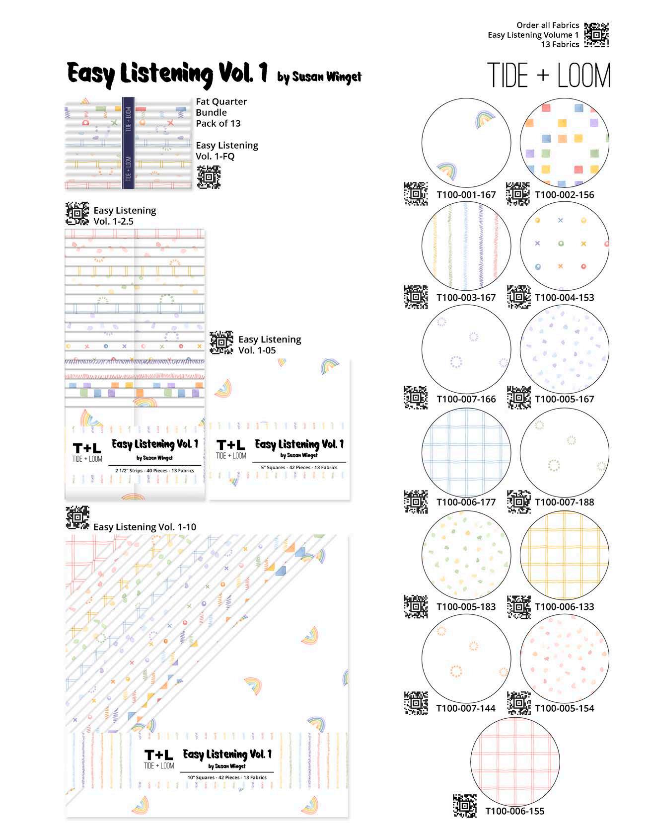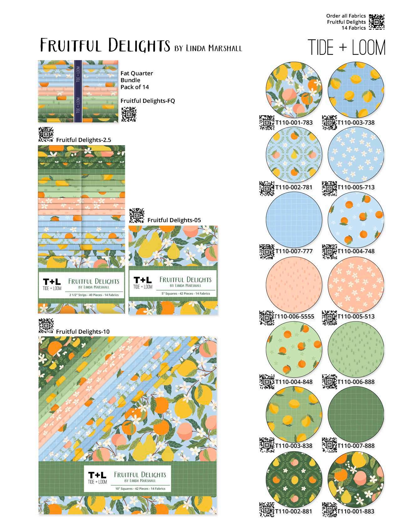 Designer projects are shown with yardage charts and QR codes. “Order All Fabrics” QR code will order all of the fabrics in the chart to meet the yardage requirements for the number of kits the shop would like; the shop will be given the option to include or exclude Backing and Binding fabrics. If a Backing or Binding fabric is a SKU that has been repeated elsewhere in the chart, a second bolt will be placed on order. Yardages will not be added together. Large continuous cuts may require additional bolts.