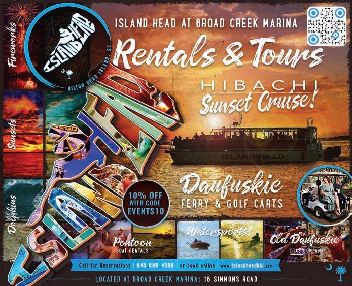 Broad Creek Marina, K-22 on map. GPS: 18 Simmons Rd. Set sail with Island Head for an unforgettable dinner cruise experience. Choose from a variety of 2-hour evening cruises including the interactive Hibachi Dinner Cruise, the relaxed Golden Hour Sunset Sail, the scenic Boat, Bite, and Bar at Old Daufuskie Crab Co., or the delicious Lowcountry Boil Dinner Cruise. There’s a cruise to match your perfect night on the water. Fun for all ages—book your experience today. See ad page 51. (843) 686-4386
