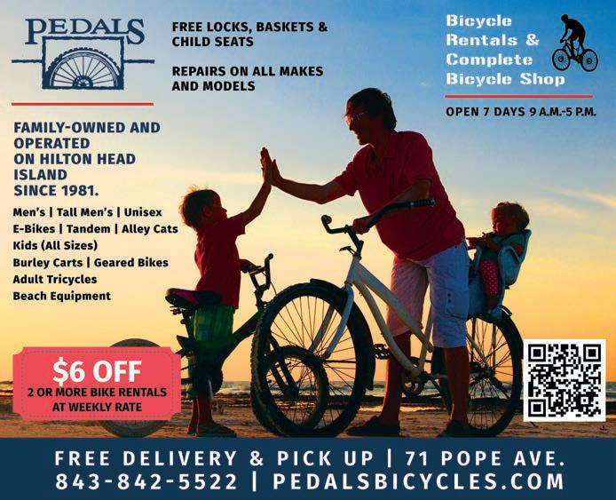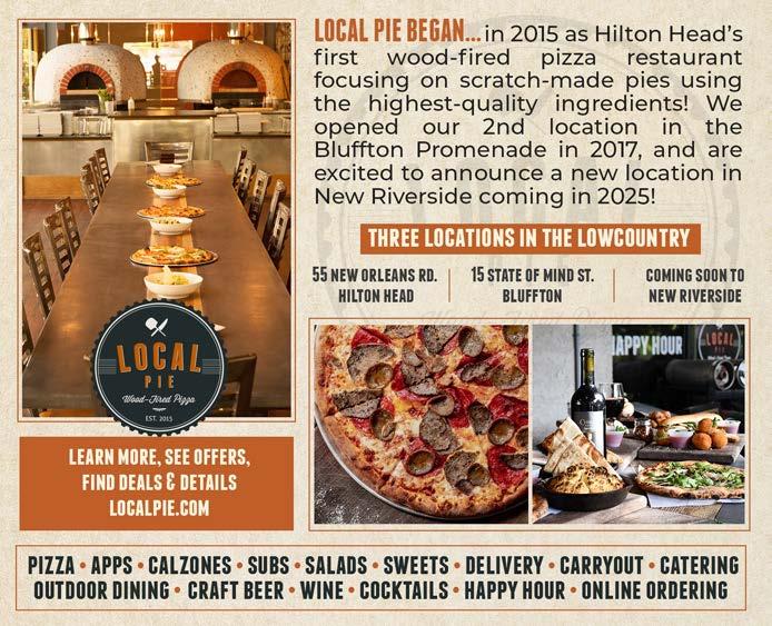 Fountain Center on New Orleans Rd. E-18 on map. GPS: 55 New Orleans Rd. #106. Local Pie is the Lowcountry’s only Neapolitanstyle, wood-fired pizza joint, with locations on Hilton Head Island and in Bluffton. The menu features handcrafted pizzas, fresh salads, hearty sandwiches, and tempting desserts, all made with locally sourced ingredients. With a cozy, welcoming vibe and creative flavor combinations, Local Pie is a go-to spot for casual, delicious dining. Delivery and take-out available. Mon.-Fri., 4-9 p.m., Sat. & Sun., 12-9 p.m. See ad page 16. (843) 842-7437