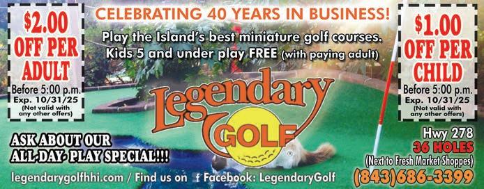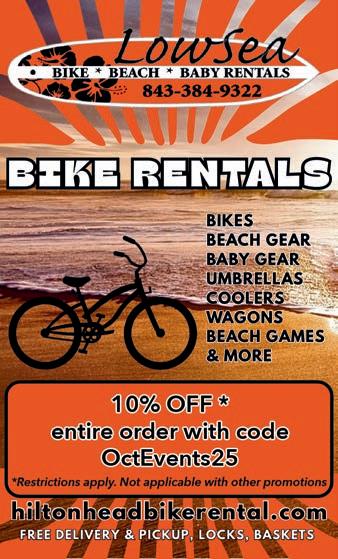 But that’s just the beginning! Also in this issue of Island Events we have our hand-picked listings for entertainment, shopping and restaurants, safety info, guides and more. Flip the pages for wildlife dos and don’ts, maps for Hilton Head’s roads and paths, a few rules and regulations to keep your stay easy. You’ll even find charts for our parks and beaches, area tides and your October horoscope! This month’s “Highlights” and Calendar of Events are included, as well, and there’s even more at www.hiltonhead.com, www.hiltonheadisland.com, www.bluffton.com, www.savannah. com, www.beaufort.com and www.stsimonisland.com.