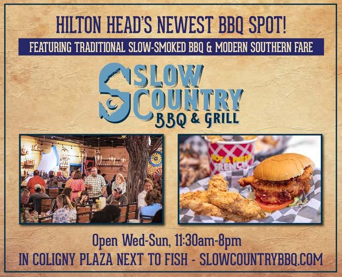 Coligny Plaza, C-18 on map. GPS: 1 N. Forest Beach Dr. Slowcountry BBQ & Grill serves up slow-smoked Lowcountry favorites in the heart of Hilton Head Island’s Coligny Plaza. The menu features tender pulled pork, fall-off-the-bone ribs, juicy brisket, and fried chicken, along with hand-pattied burgers, fresh salads, and scratch-made sides. With a laid-back atmosphere and rich Southern flavors, Slowcountry BBQ & Grill is the perfect spot for hearty, satisfying coastal comfort food. Delivery and take-out available. Happy Hour, 4-6 p.m., Wed.-Sun., 11:30 a.m. 8 p.m. See ad page 13. (843) 341-3473