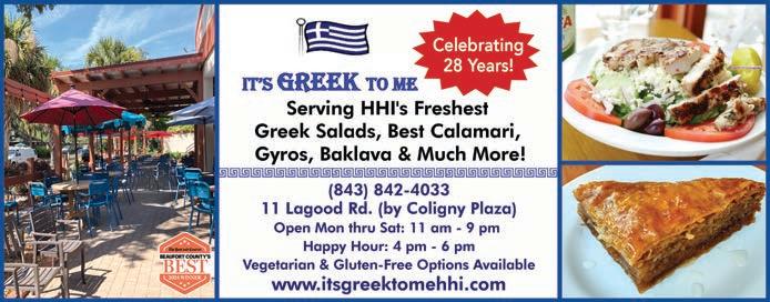 cialty and authentic Greek dishes prepared from scratch using secret family recipes and only the finest ingredients. Enjoy a cozy atmosphere, friendly staff, and a diverse menu catering to every palate. Lunch and dinner are served Mon.-Sat. from 11 a.m.-9 p.m. Dine indoors or on the outdoor patio. Take-out and kid-friendly menu available. Plenty of parking. See ad page 15. (843) 842-4033