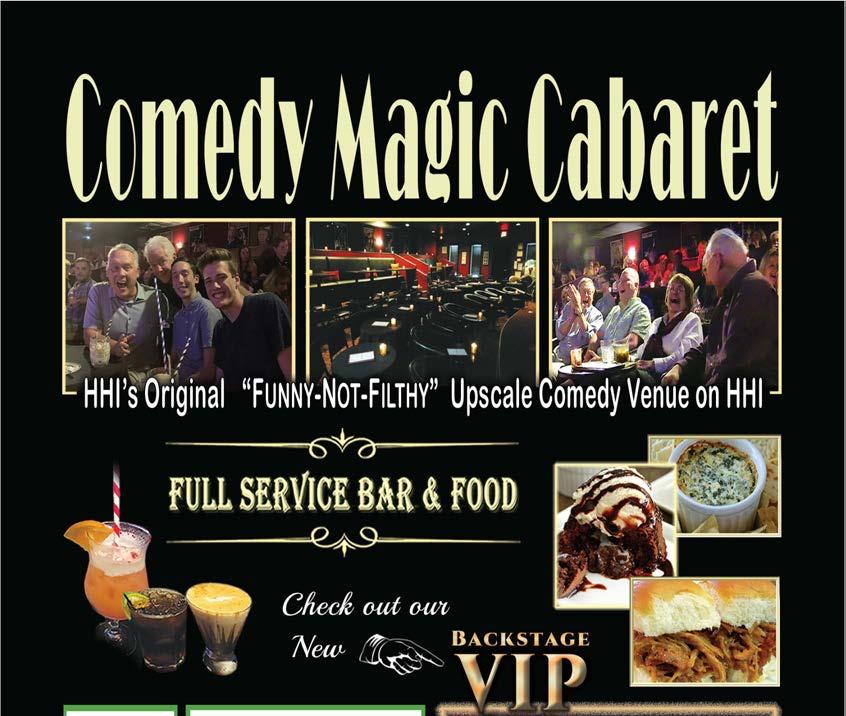 South Island Sq., F-24 on map. GPS: 843 Wm. Hilton Pkwy. Comedy Magic Cabaret presents national headliner Kerry Pollock, with various guest performers. All headliners are nationally touring comedy-magicians and standup comedians. Kerry is a favorite at the world-famous Magic Castle in Hollywood. Kerry’s “Funny Not Filthy” approach has contributed to a refreshing and entertaining show, which has earned Comedy Magic Cabaret #1 for HHI nightlife on TripAdvisor. Teens are welcome, if accompanied by a parent. See ad page 7. (843) 681-7757