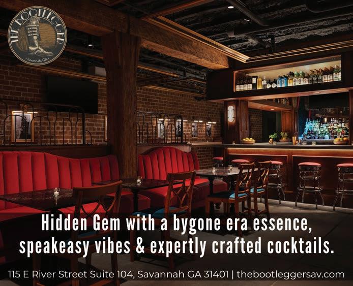 115 E. River St., A-7 on map. The Bootlegger is Savannah’s hidden speakeasy, tucked away in the heart of River Street. Inspired by the Prohibition era, it blends timeless flavors and classic cocktails with an atmosphere of intrigue, where every drink feels like a secret worth sharing. Step into the Roaring Twenties on the first Friday of each month or join us for Happy Hour Sunday–Thursday from 11 a.m.–4 p.m. and 7 p.m.–8 p.m. Whether you’re savoring handcrafted cocktails or soaking in the clandestine charm, every visit tells a story. Open daily, 11 a.m.–11 p.m. See ad page 13.