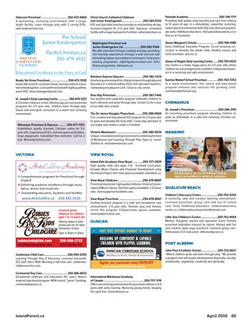 Chemainus St. Joseph’s Preschool..............................250-246-3191 An enriching preschool program allowing children to grow as individuals in a safe and nurturing Christian environment.