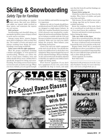 sure that the boots fit and the bindings are adjusted correctly. Prepare before going out Check the weather forecast. Dress for the weather. Wear layers of clothes and pack extra hats and mitts. Take lessons. If your child or teen is new to skiing, sign him up for lessons with a certified instructor. Know the condition of the trails. Don’t ski or snowboard on trails that are closed or if you don’t know the conditions. Exercise and stretch to warm up muscles before hitting the slopes. Take care while on the slopes Never ski or snowboard alone. Ask older children to check in regularly with an adult. Be aware of physical and environmental hazards like trees or icy patches on the trail. Respect limits. Don’t ski or snowboard on hills that are above your skill level. Teach your children or teens that it’s important that they try more difficult slopes gradually and only as their skills get better. Check regularly for frostbite. Rest when tired. Reprinted with permission from the Canadian Paediatric Society. For more information, visit www.caringforkids.cps.ca.