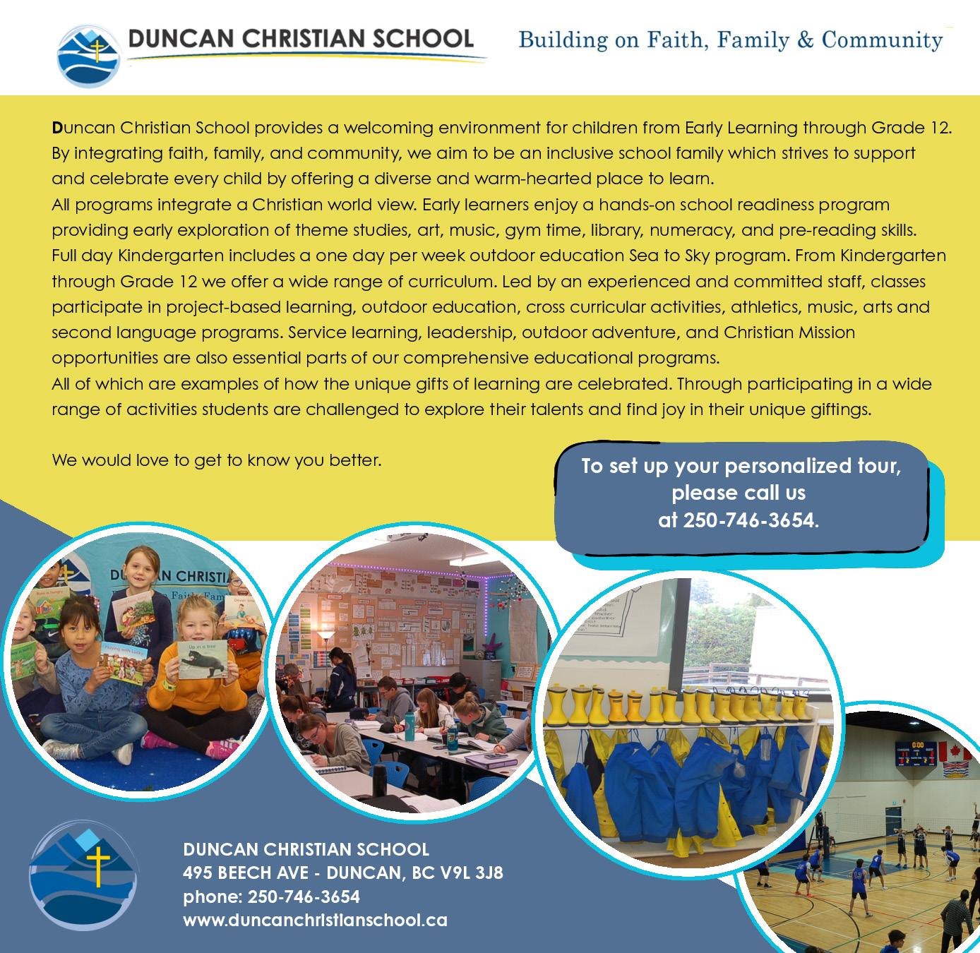 Duncan Christian School provides a welcoming environment by integrating faith, family and community, and by being an inclusive school which supports and celebrates every child.