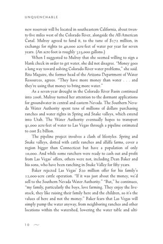 new reservoir will be located in southeastern California, about twenty-five miles west of the Colorado River, alongside the All-American Canal. Mulroy agreed to fund it, to the tune of $172 million, in exchange for rights to 40,000 acre-feet of water per year for seven years. (An acre-foot is roughly 325,000 gallons.) When I suggested to Mulroy that she seemed willing to sign a blank check in order to get water, she did not disagree. “Money goes a long way toward solving Colorado River water problems,” she said. Rita Maguire, the former head of the Arizona Department of Water Resources, agrees. “They have more money than water . . . and they’re using that money to bring more water.” As a seven-year drought in the Colorado River Basin continued into 2006, Mulroy turned her attention to the dormant applications for groundwater in central and eastern Nevada. The Southern Nevada Water Authority spent tens of millions of dollars purchasing ranches and water rights in Spring and Snake valleys, which extend into Utah. The Water Authority eventually hopes to transport 91,000 acre-feet of water to Las Vegas through a pipeline estimated to cost $2 billion. The pipeline project involves a clash of lifestyles. Spring and Snake valleys, dotted with cattle ranches and alfalfa farms, cover a region bigger than Connecticut but have a population of only 10,000. And while some ranchers were ready to cash out and profit from Las Vegas’ offers, others were not, including Dean Baker and his sons, who have been ranching in Snake Valley for fifty years. Baker rejected Las Vegas’ $20 million offer for his family’s 12,000-acre cattle operation. “If it was just about the money, we’d sell to the Southern Nevada Water Authority.” “But,” he continues, “my family, particularly the boys, love farming. They enjoy the livestock, they like raising their family here and the children, so it’s the values of here and not the money.” Baker fears that Las Vegas will simply pump the water anyway, from neighboring ranches and other locations within the watershed, lowering the water table and ulti10